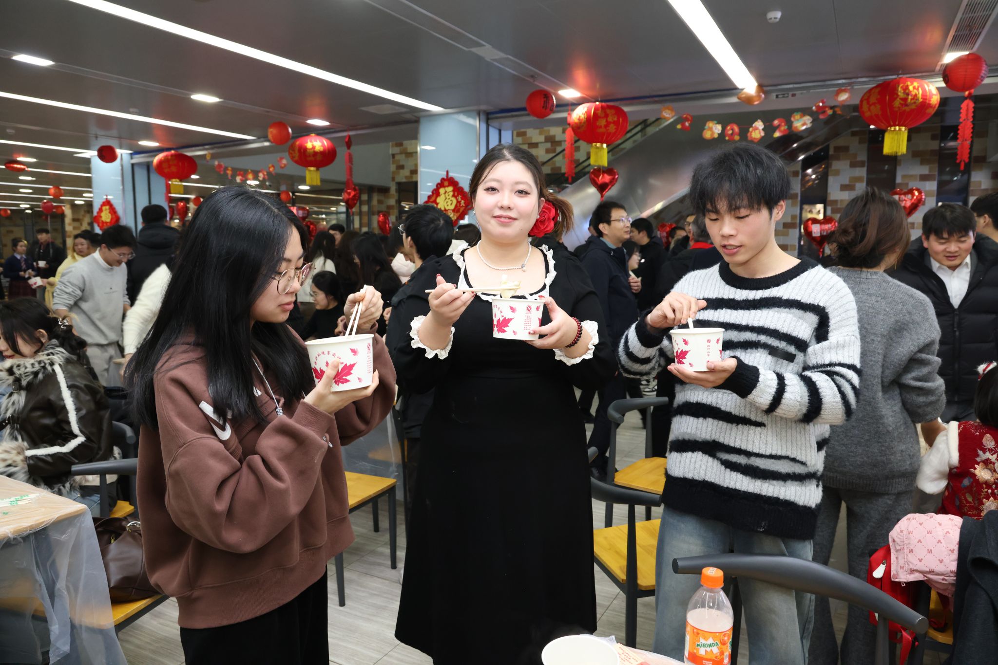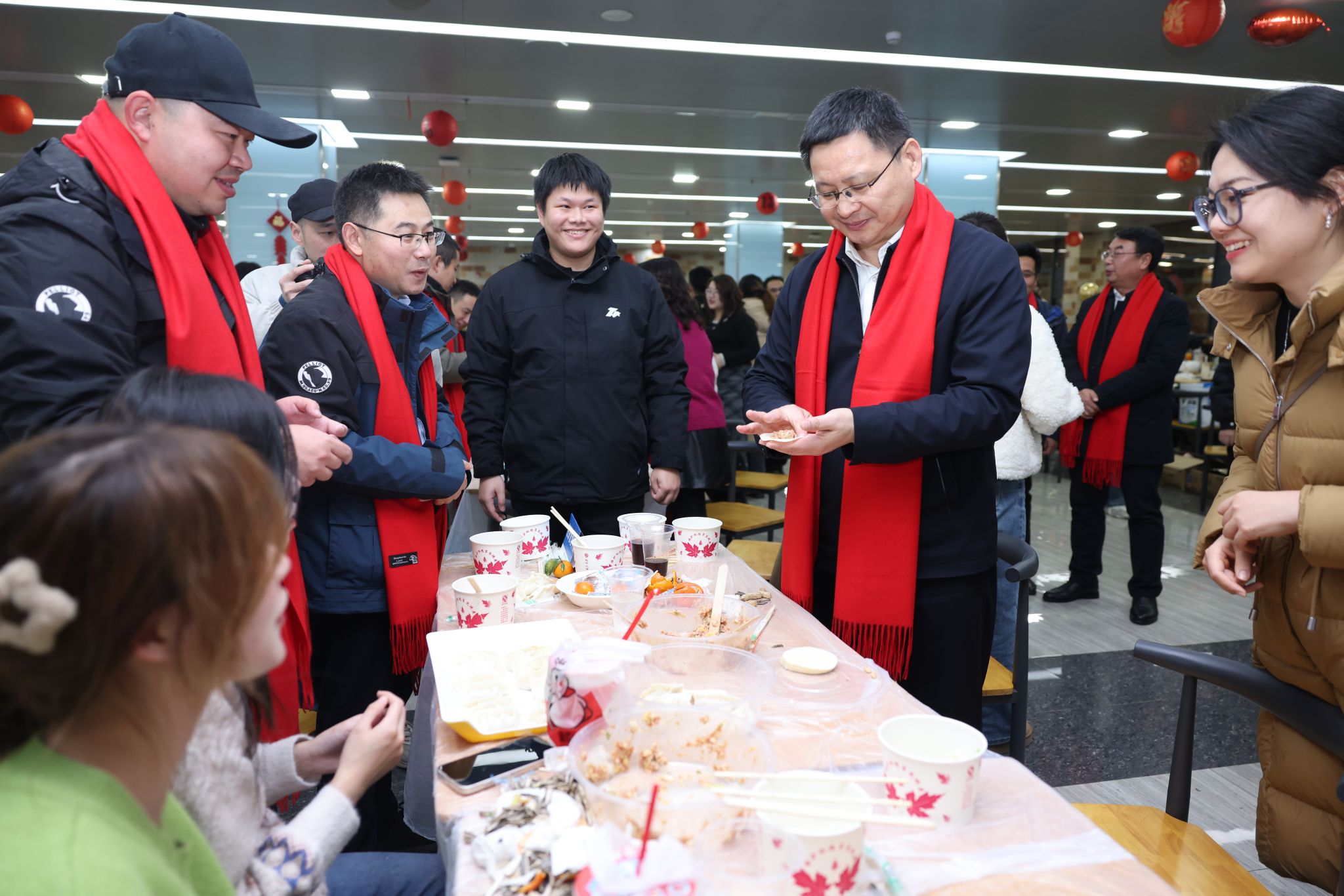 在紅燈籠、中國結與彩旗的裝飾下,未來城校區學一食堂二樓“年味滿滿”。晚上八點,我校校領導、鄂州市人民政府領導,與在場師生一起包餃子。五顏六色的餃子里,包的是全體師生對2025年美好的祝愿。幸運紅糖餃、抽取“2025未來錦鯉”、猜燈謎、新年傳話筒等活動也依次進行,現場歡聲笑語不斷。
