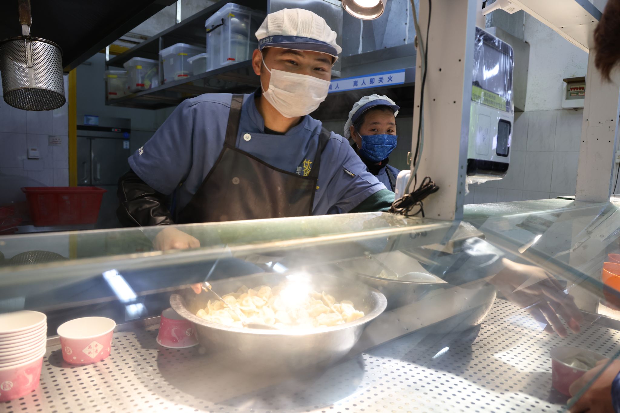 南望山校區學三食堂暖意融融,“深夜食堂”活動開啟,食堂各個窗口都在為師生免費派發新出鍋的餃子。校領導與同學們共同進餐,一份份熱乎乎的餃子,在寒冷的冬天為師生送來溫暖和祝福。