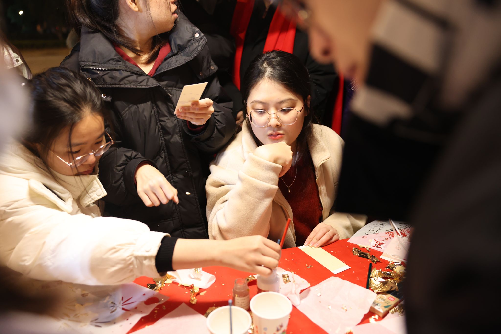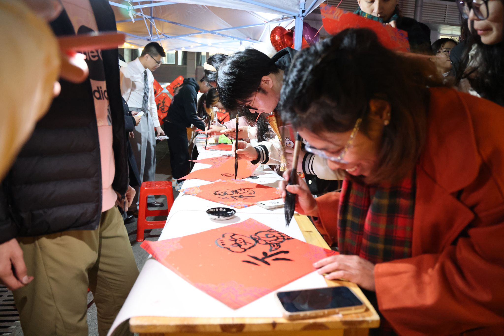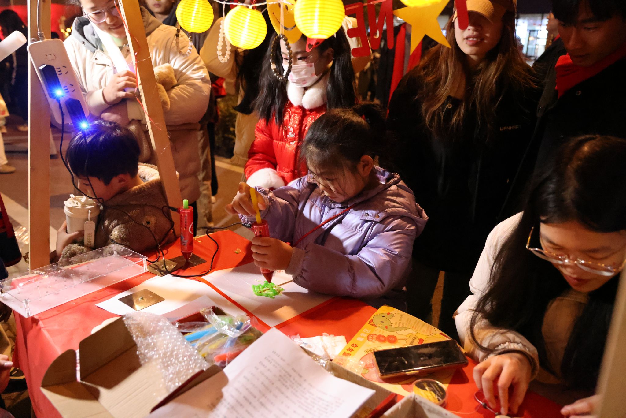 在南望山校區弘毅路上,來自16個學院的50個攤位盛情開啟,精彩連連,“福韻年俗街”“瑞物盈門集”“笑語文娛廊”“樂趣體驗坊”“智趣學海園”五大板塊各具特色,給師生帶來豐富的新年活動體驗。福韻年俗街上,靈韻笛簫社樂聲悠揚,傳遞著濃濃的年味;在面部彩繪攤位前,人潮涌動,畫師正精心為游客繪制圖案,分享著新年的祝福。藝媒學院“接歌大王”活動、公共管理學院“吹墨畫”活動和資源學院“制作漆扇”活動別具特色。海洋學院“沙畫繪制”、地球科學學院“地質接接樂”吸引了師生們駐足參與,機電學院“機械臂與機器狗”展示逗趣可愛。