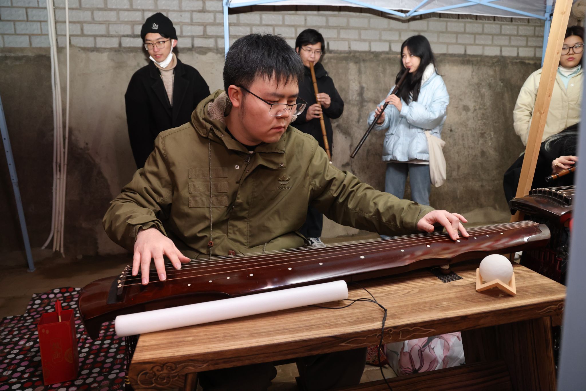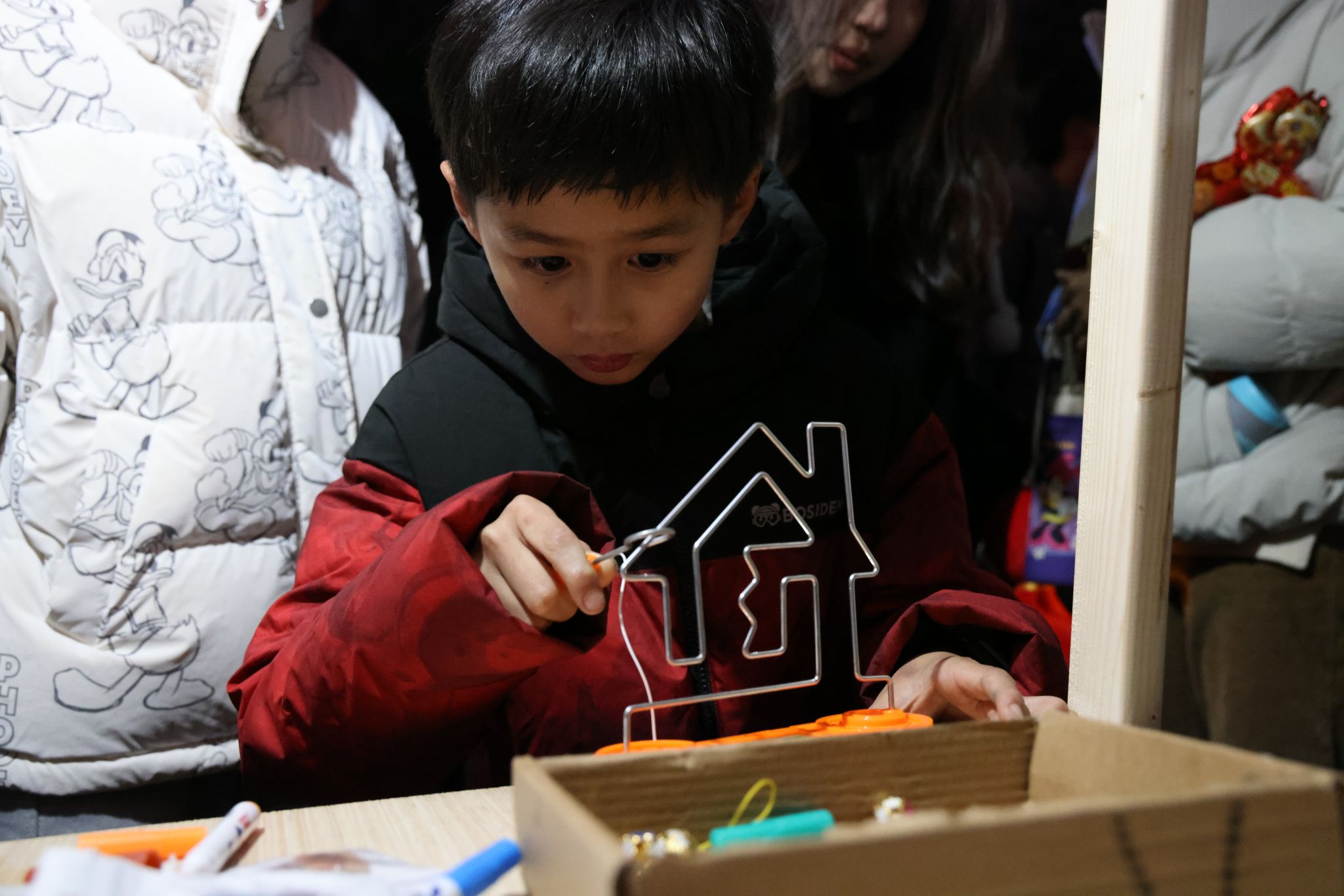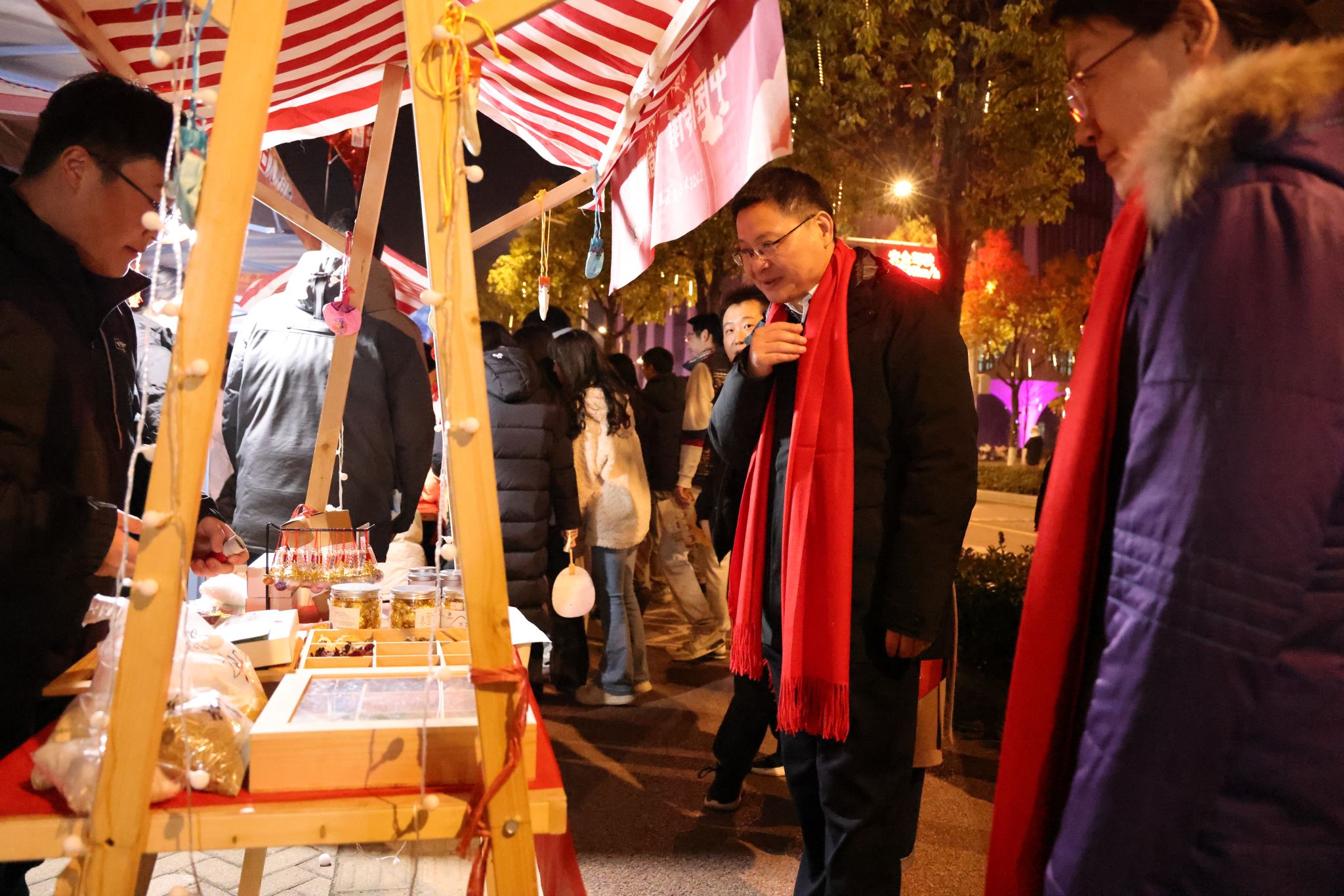 在南望山校區弘毅路上,來自16個學院的50個攤位盛情開啟,精彩連連,“福韻年俗街”“瑞物盈門集”“笑語文娛廊”“樂趣體驗坊”“智趣學海園”五大板塊各具特色,給師生帶來豐富的新年活動體驗。福韻年俗街上,靈韻笛簫社樂聲悠揚,傳遞著濃濃的年味;在面部彩繪攤位前,人潮涌動,畫師正精心為游客繪制圖案,分享著新年的祝福。藝媒學院“接歌大王”活動、公共管理學院“吹墨畫”活動和資源學院“制作漆扇”活動別具特色。海洋學院“沙畫繪制”、地球科學學院“地質接接樂”吸引了師生們駐足參與,機電學院“機械臂與機器狗”展示逗趣可愛。