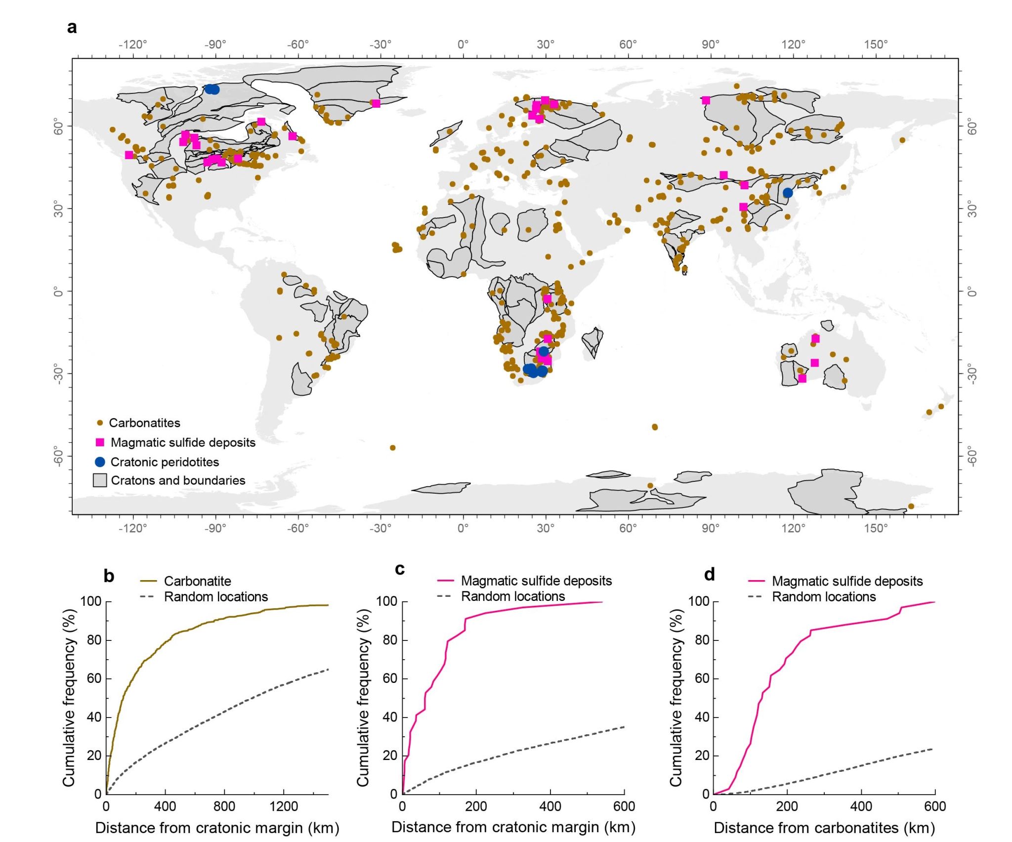 該論文通過對碳酸巖、硫化物礦床和克拉通的時空相關(guān)性分析,發(fā)現(xiàn)克拉通邊緣區(qū)域同時富集火成碳酸巖和巖漿硫化物礦床,硫化物礦床與碳酸巖通常具有時空一致性,表明由碳酸鹽熔體遷移形成的富硫化物大陸根控制了巖漿硫化物礦床的分布。該研究揭示了硫化物礦床與碳酸巖之間的成因關(guān)系,發(fā)現(xiàn)了克拉通邊緣的富碳酸巖區(qū)域是關(guān)鍵金屬的富集地,這一發(fā)現(xiàn)為未來礦產(chǎn)資源的勘探和開發(fā)提供了科學依據(jù)和重要方向。