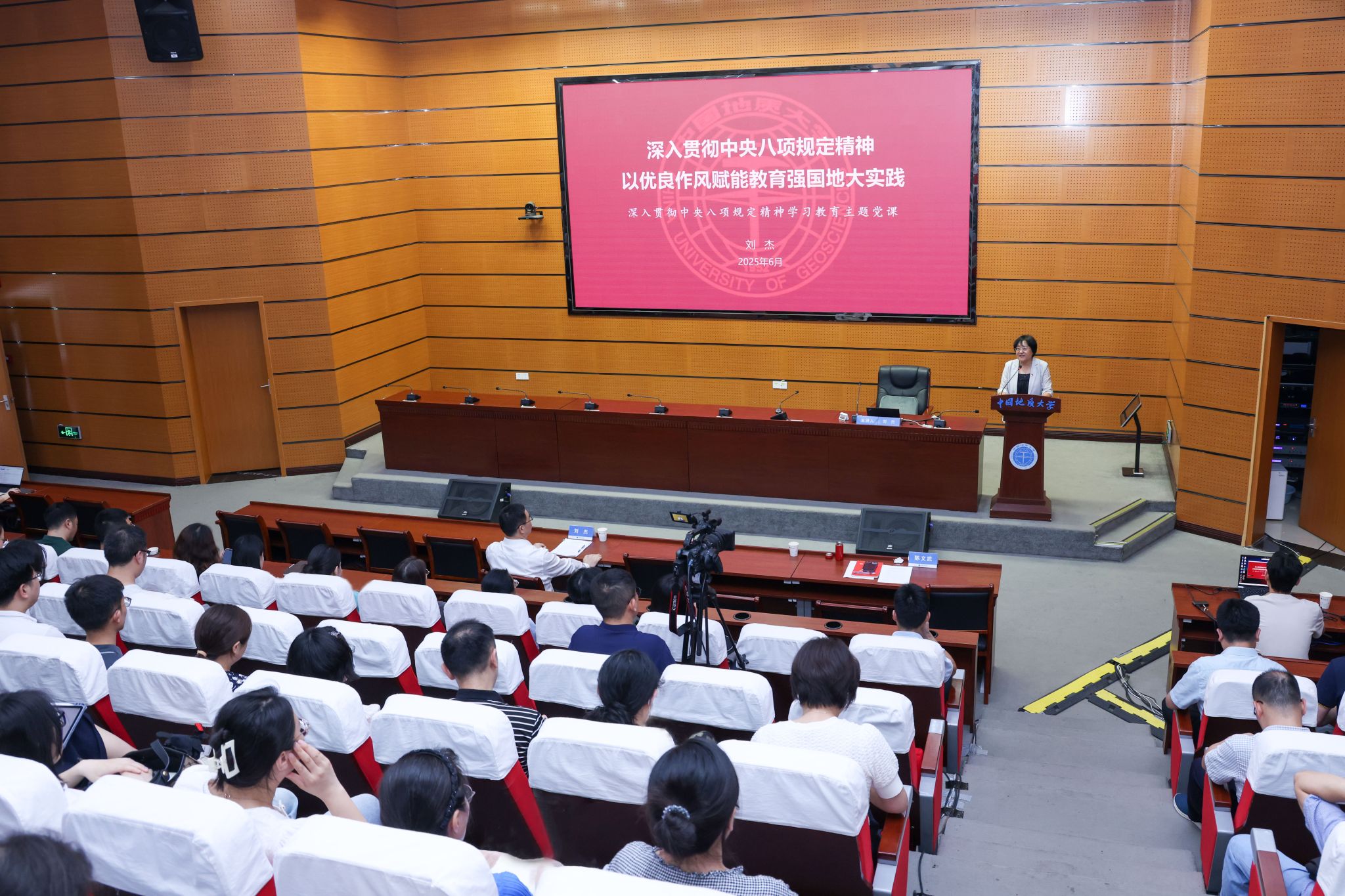 地大新聞網訊(通訊員 李海涵 攝影 李銳欣)為推進深入貫徹中央八項規定精神學習教育走深走實,6月25日,校黨委書記劉杰以《深入貫徹中央八項規定精神,以優良作風賦能教育強國地大實踐》為題講授主題黨課。黨委常委、組織部部長陳文武主持學習,全體教職工黨支部委員,馬克思主義學院、教育研究院學生代表參加。
