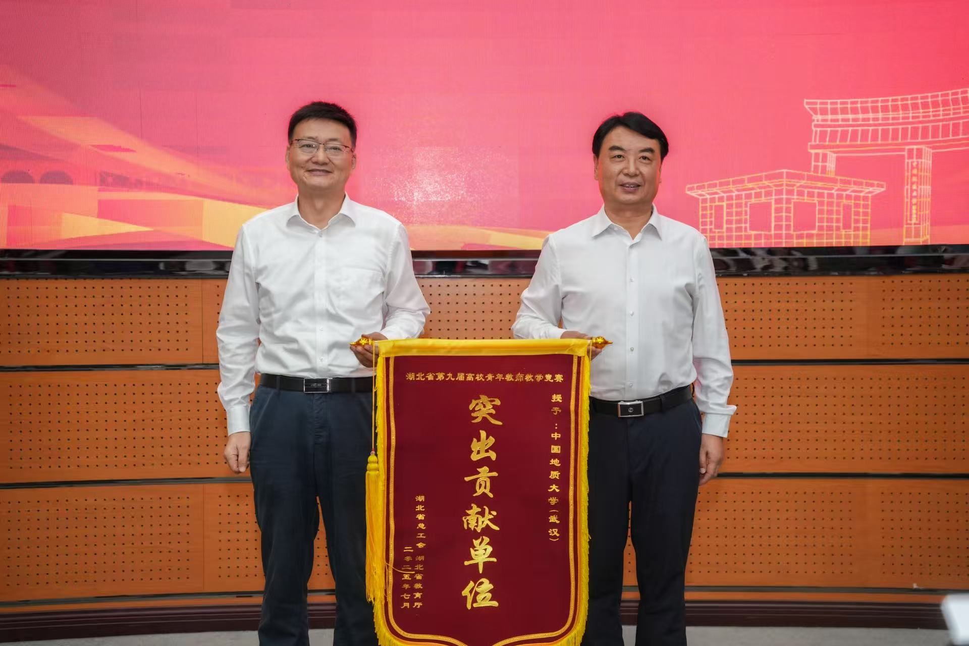 作為賽事協辦方,我校被授予“突出貢獻單位”。湖北省總工會黨組成員、經審委員會主任汪勝全向我校授旗。