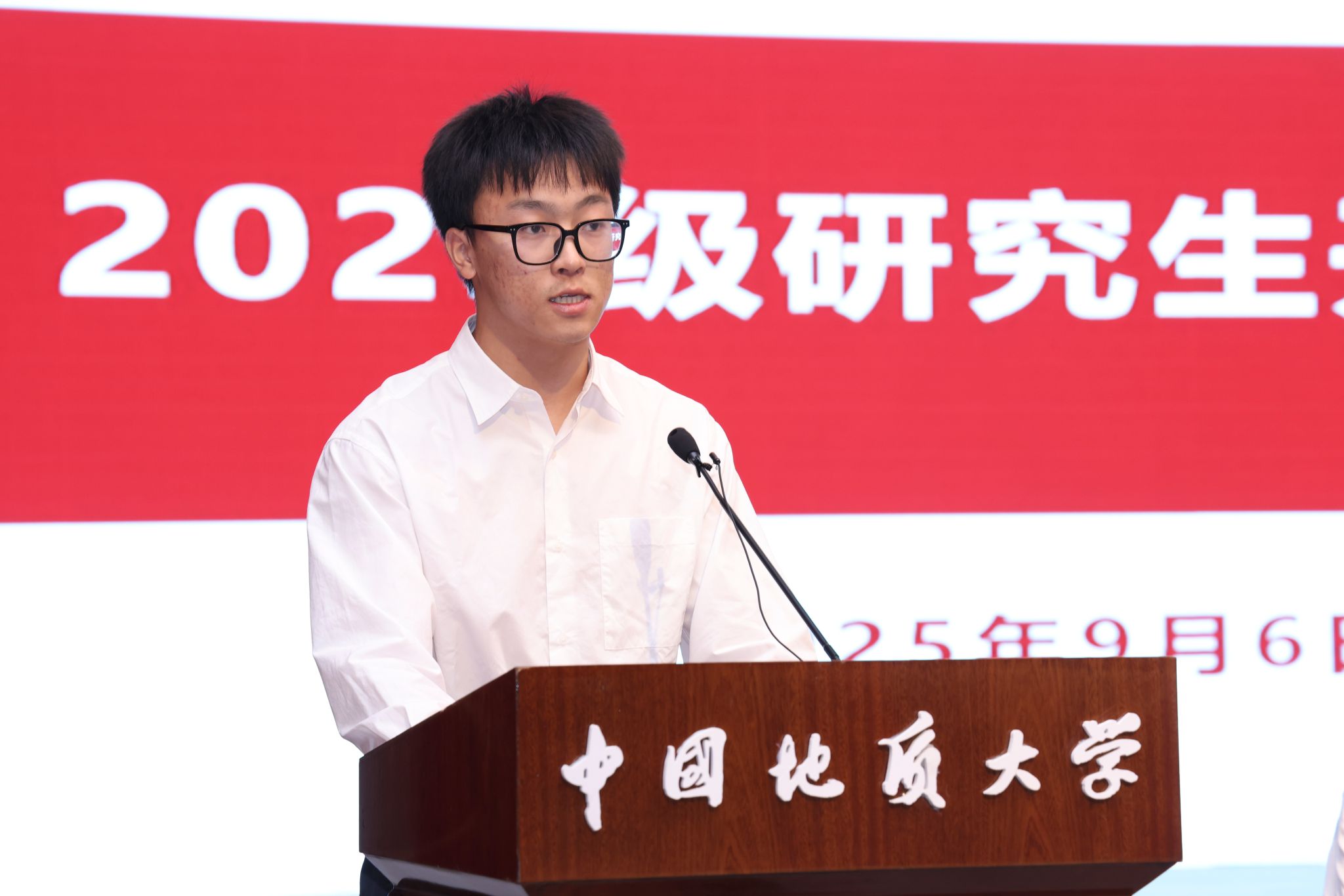 新生代表、卓越工程師學(xué)院2025級工程碩博士培養(yǎng)改革專項(xiàng)研究生余泮發(fā)言。他表示,作為工程碩博專項(xiàng)培養(yǎng)體系中的一員,將接受地大和東風(fēng)集團(tuán)的聯(lián)合培養(yǎng),心中充滿使命的厚重與前行的期待。他將扎根實(shí)踐,在解決真問題中錘煉工程能力;聚焦前沿,在交叉融合中激發(fā)創(chuàng)新活力;勇?lián)姑趪覒?zhàn)略中定位人生價值,以實(shí)踐砥礪真知,以創(chuàng)新引領(lǐng)發(fā)展,以擔(dān)當(dāng)詮釋赤誠,將個人的奮斗融入民族復(fù)興的浩蕩征程,為中國式現(xiàn)代化建設(shè)貢獻(xiàn)青春力量。