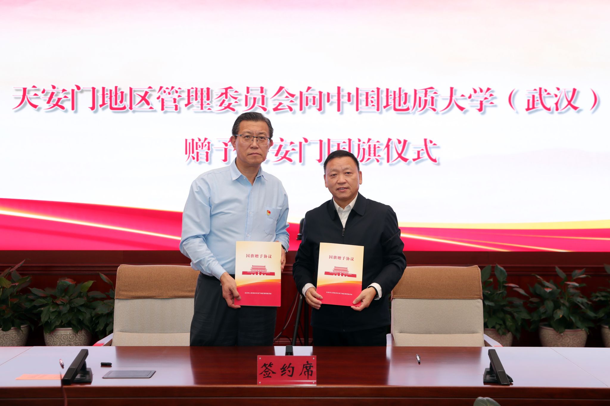 地大新聞網訊(記者 張玉賢)9月25日,北京市人民政府天安門地區管理委員會向中國地質大學(武漢)贈送天安門國旗。贈予儀式在天安門地區運行調度中心舉行,天安門地區管委會黨組成員、副主任(正局長級)姚輝向學校贈送國旗,黨委副書記王林清代表學校接收國旗、簽署《國旗贈予協議》,黨委宣傳部、圖書檔案與文博部、資產經營公司相關同志參加贈旗儀式。