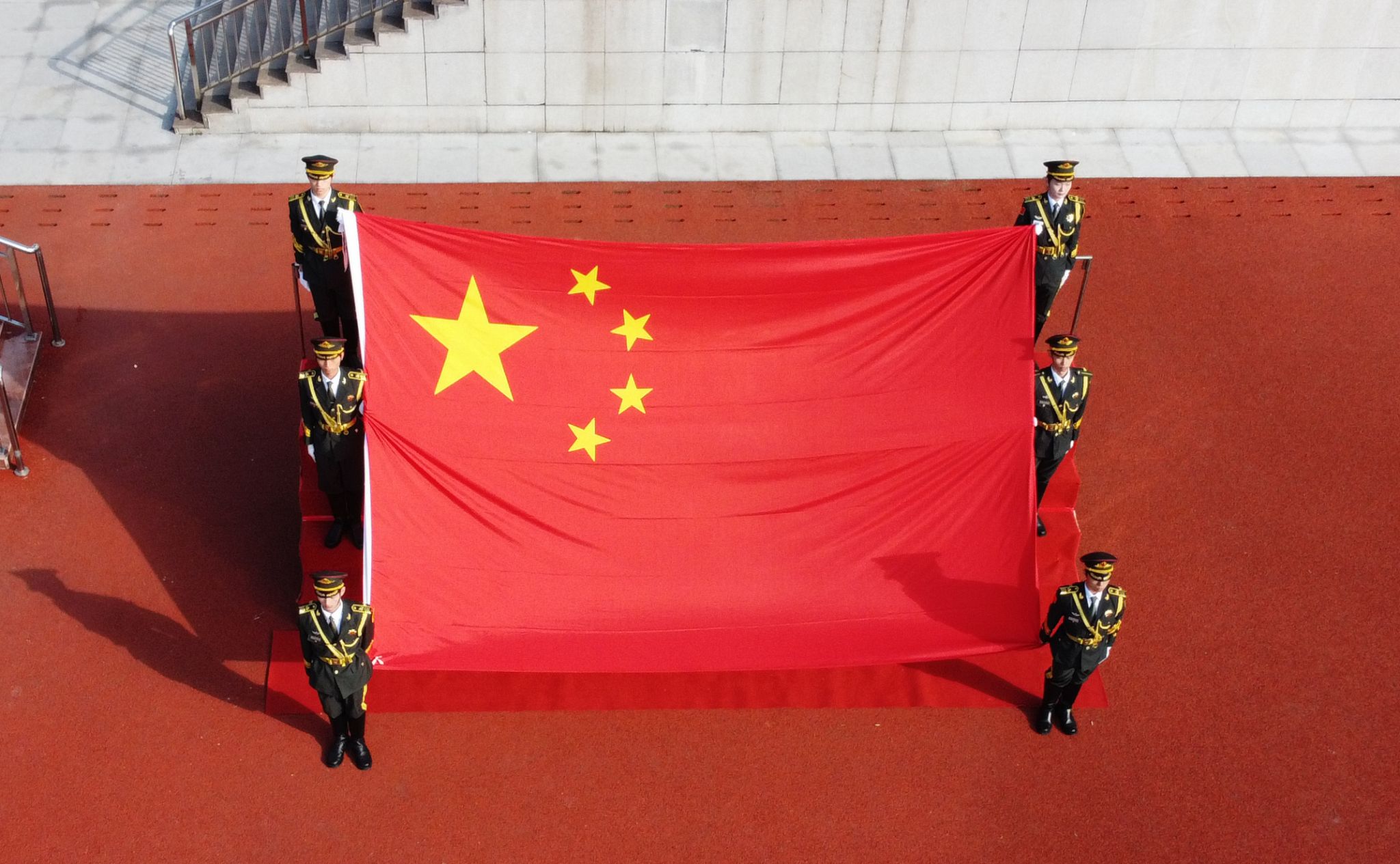 這面承載著國家儀式榮光的國旗,曾于2012年11月7日清晨,在北京天安門廣場冉冉升起。國旗長5米、高3.3米,整幅旗面無拼接,5顆五角星采用人工絲網印染工藝,編號為“2012—0041”,具有唯一屬性和特殊意義。經學校申請,今年9月25日,天安門地區管理委員會批準將這面國旗贈予學校,用于開展愛國主義教育活動。