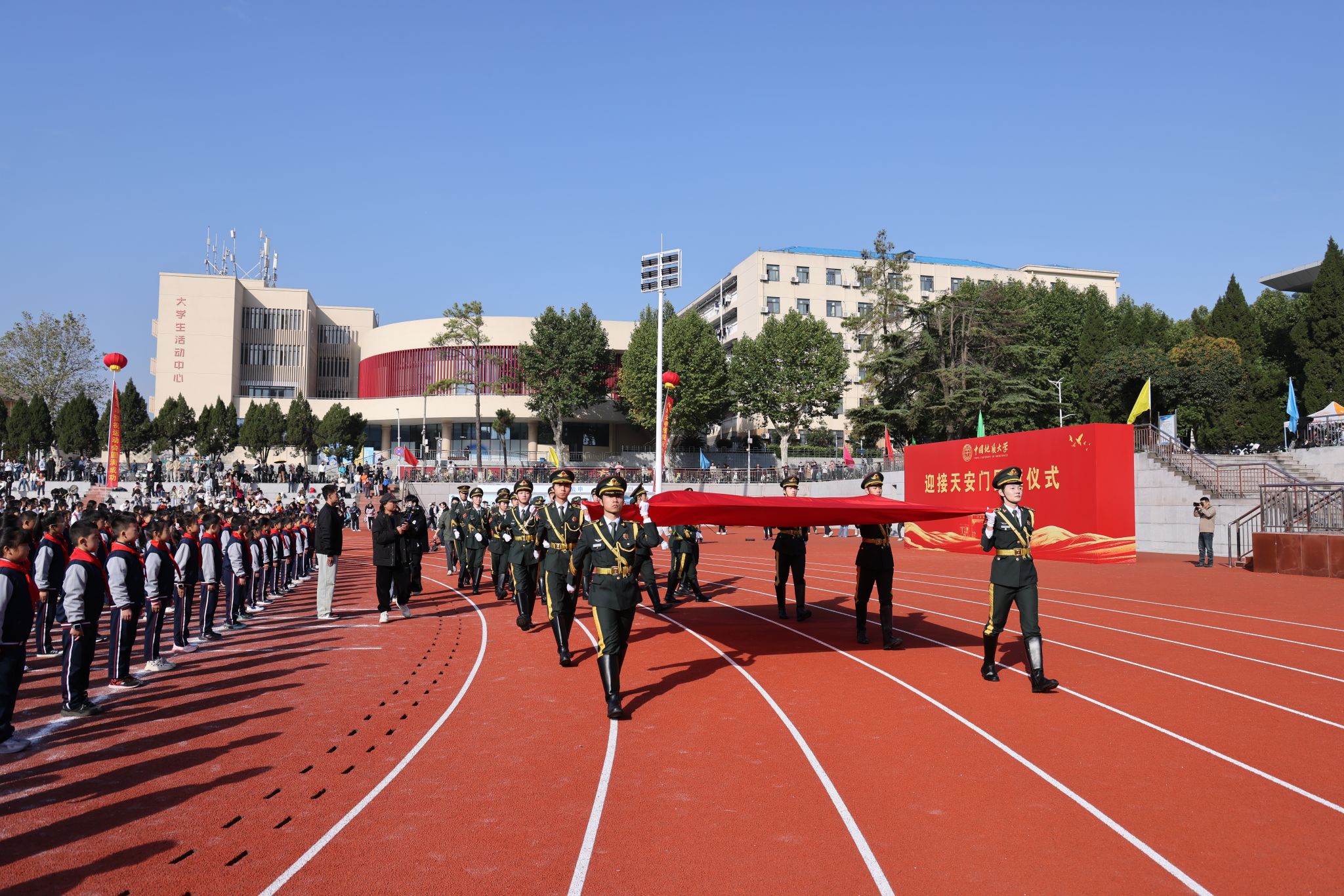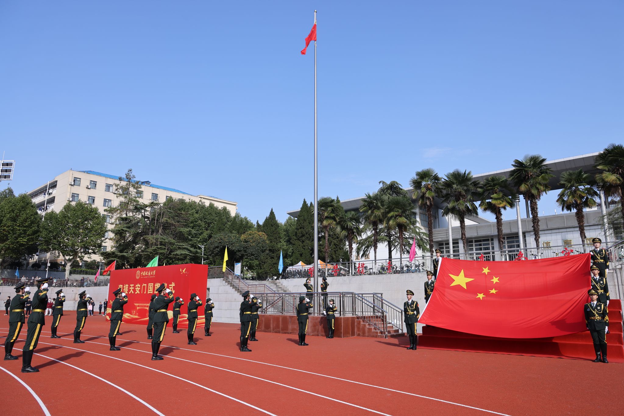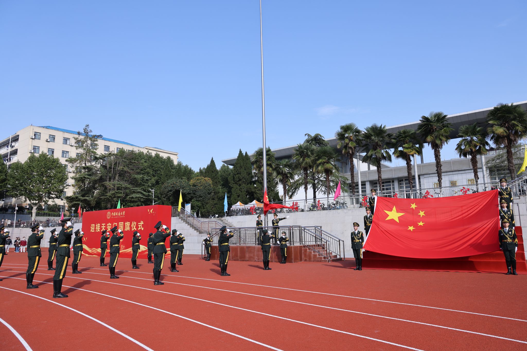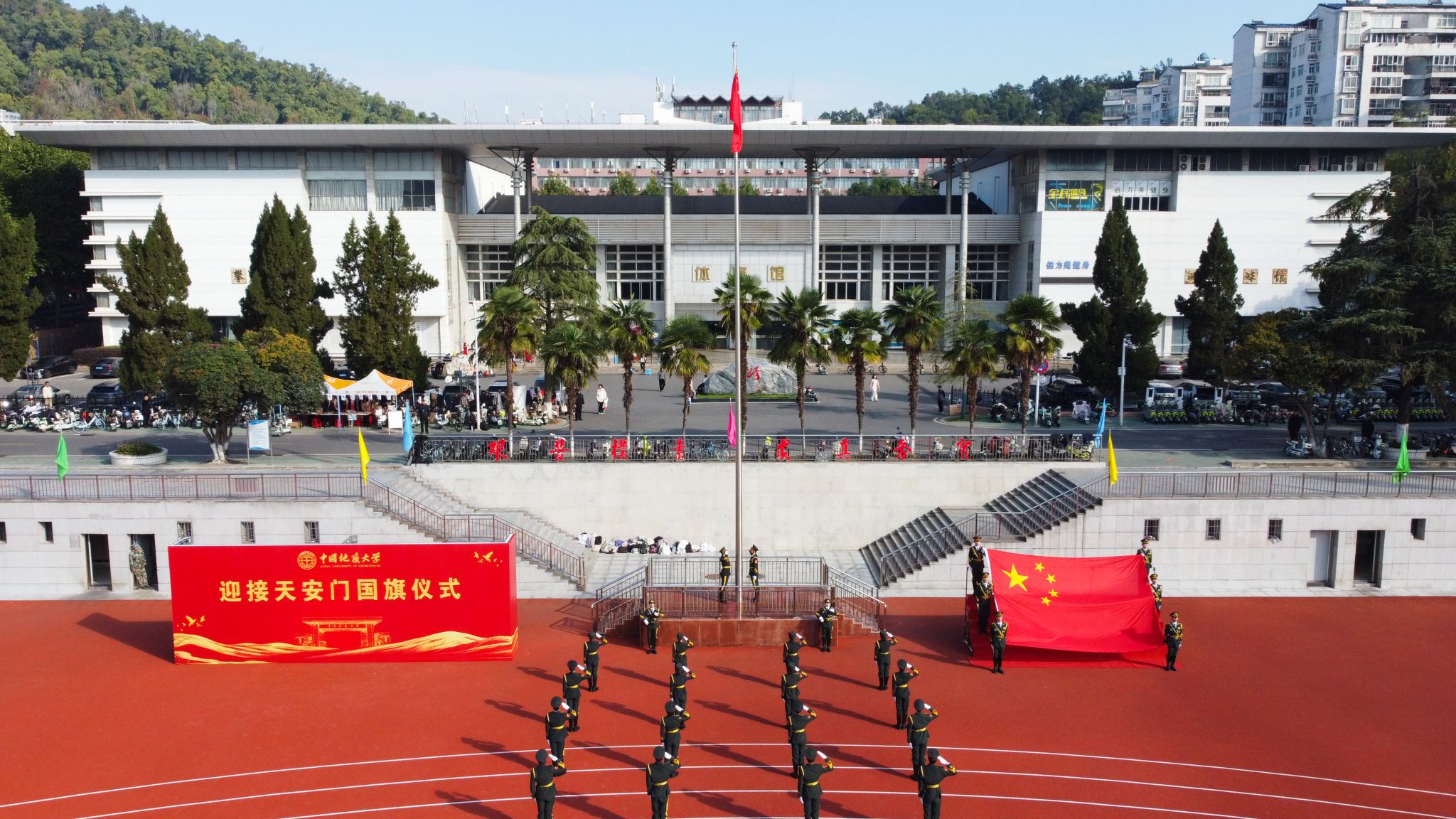 10月24日,我校在南望山校區西區運動場隆重舉行迎接天安門國旗儀式。全體在校校領導,各學院、管理與服務機構相關負責人,以及師生代表參加儀式。