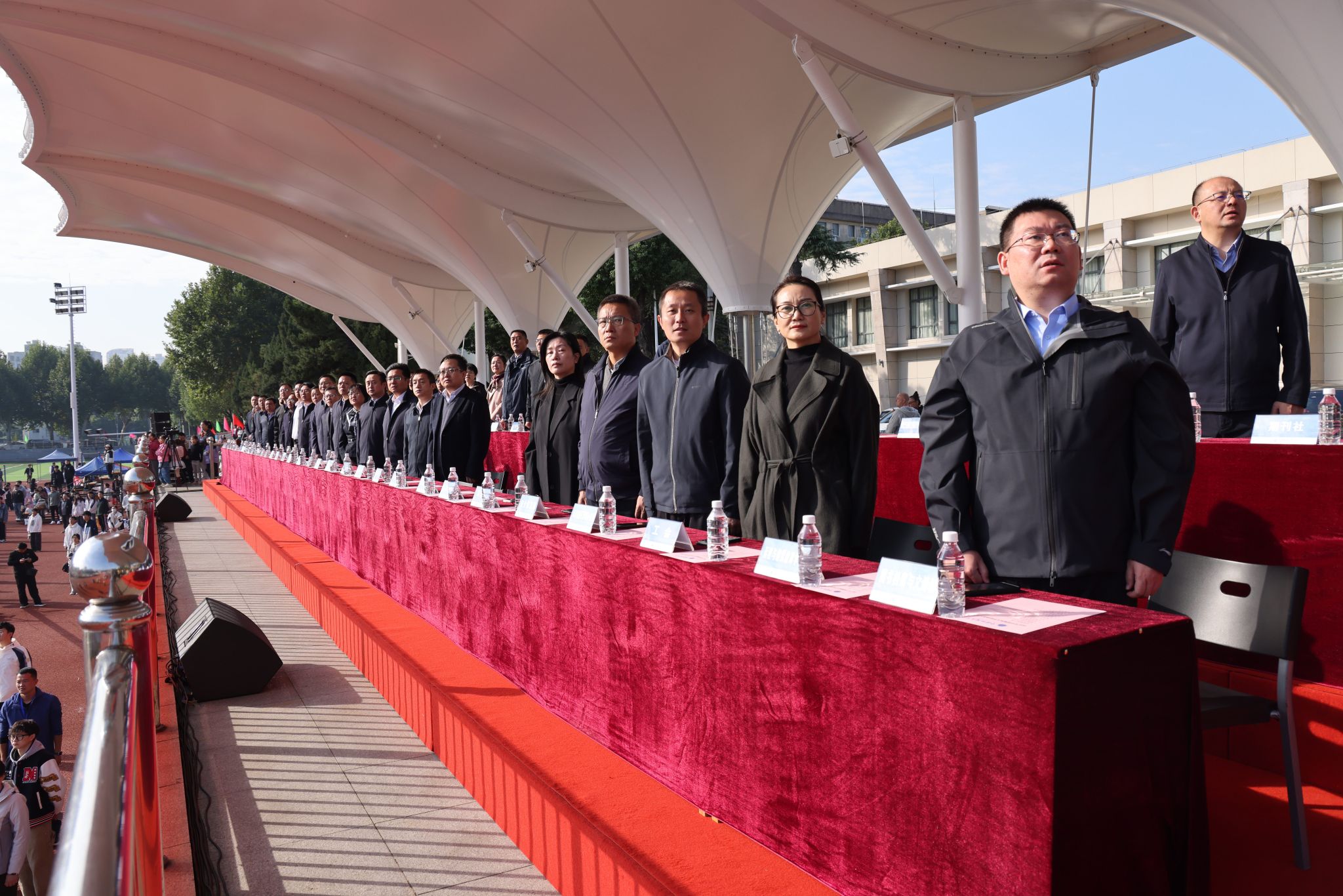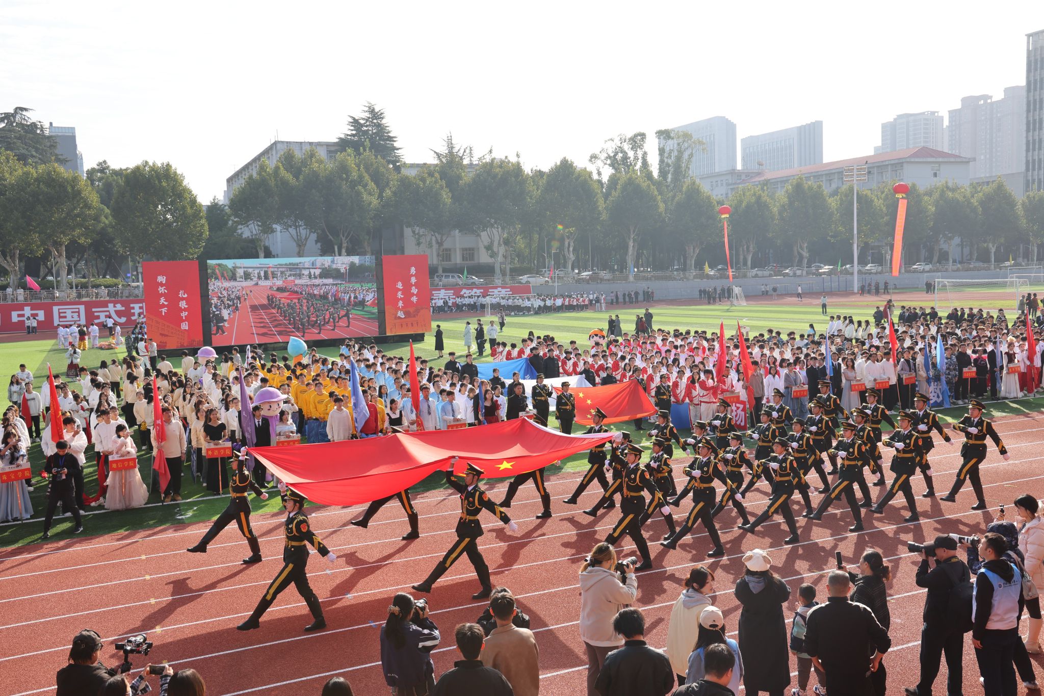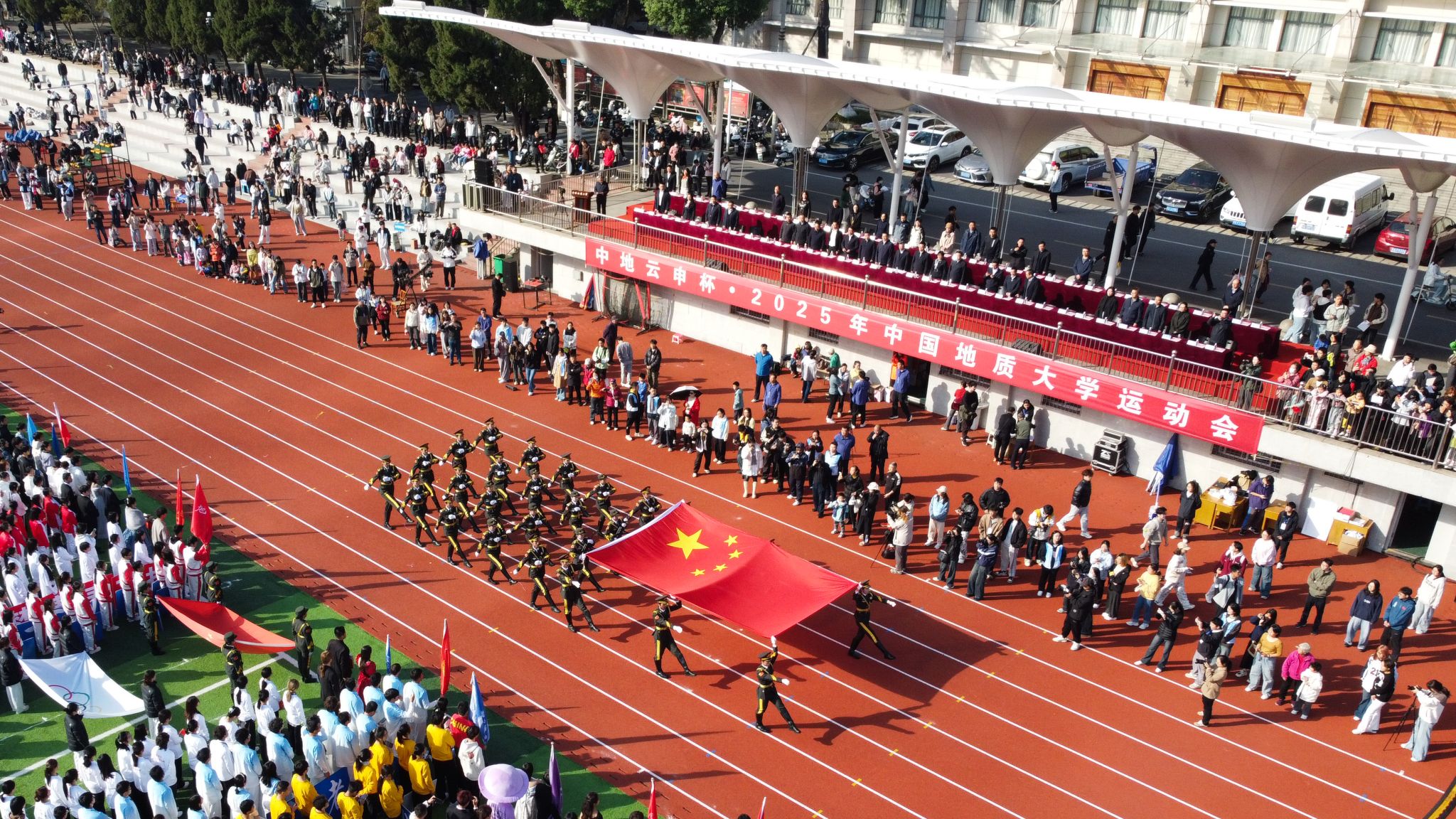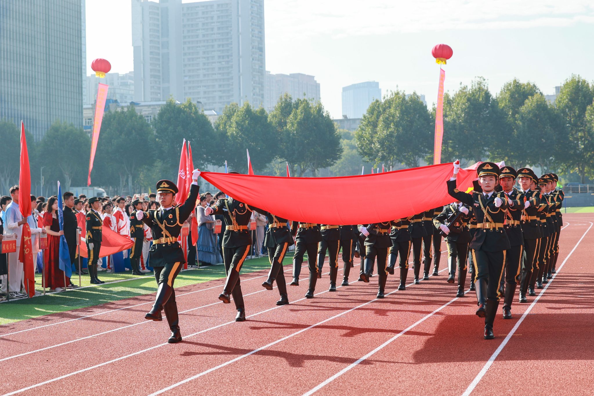 10月24日,我校在南望山校區西區運動場隆重舉行迎接天安門國旗儀式。全體在校校領導,各學院、管理與服務機構相關負責人,以及師生代表參加儀式。
