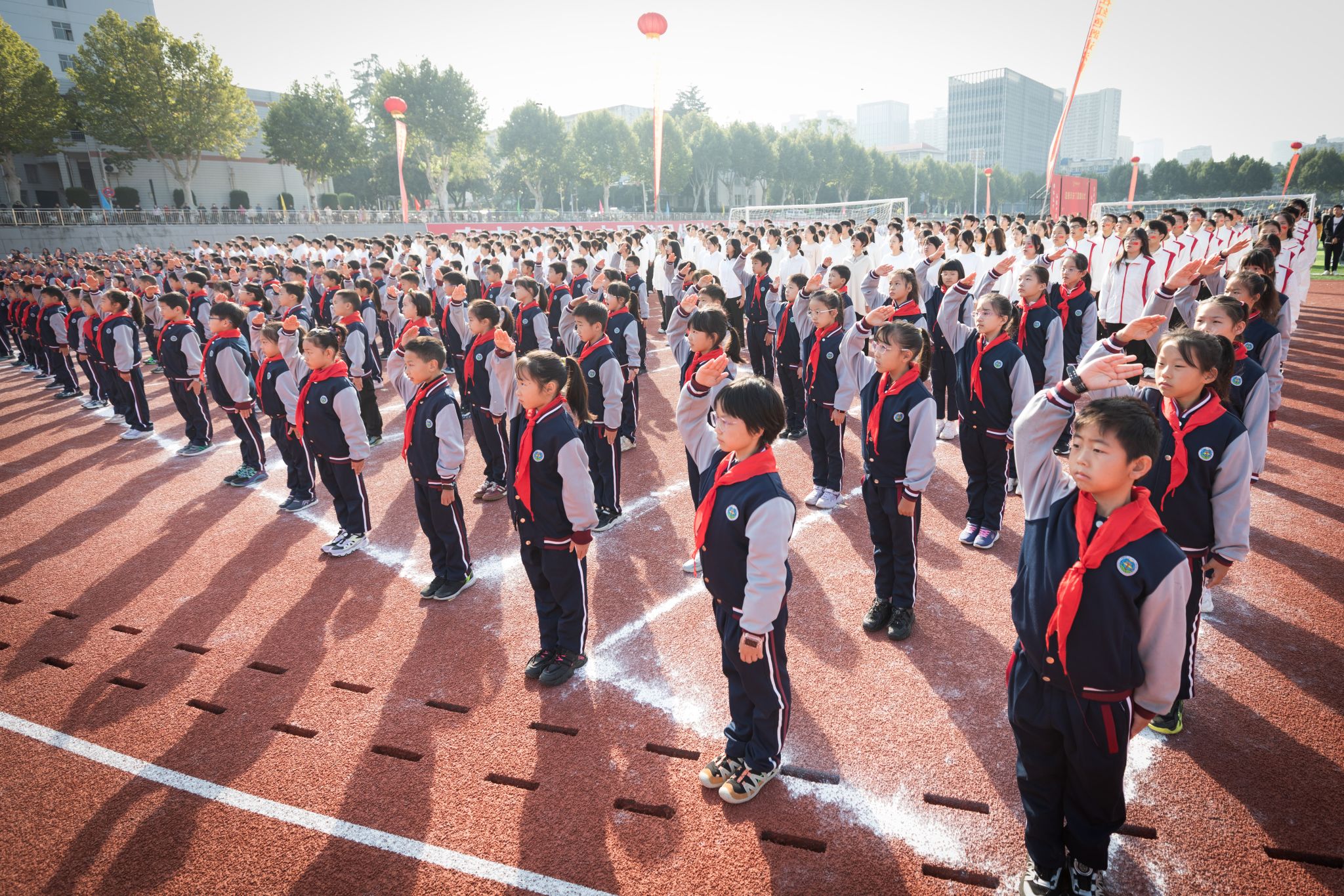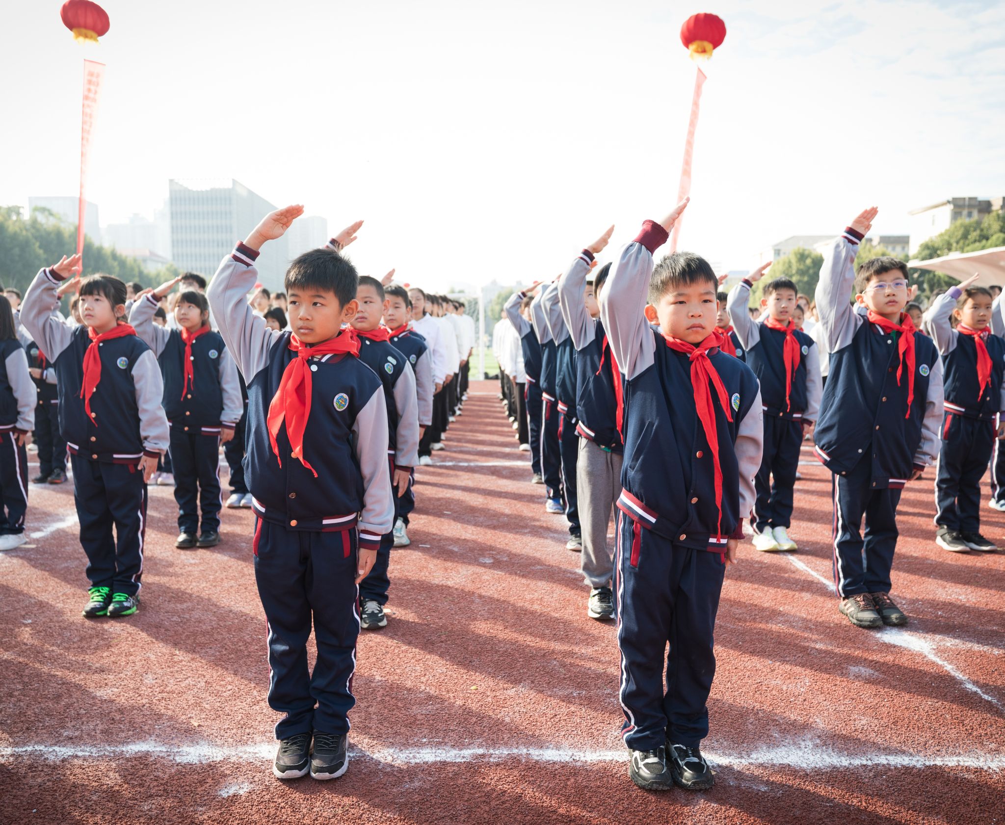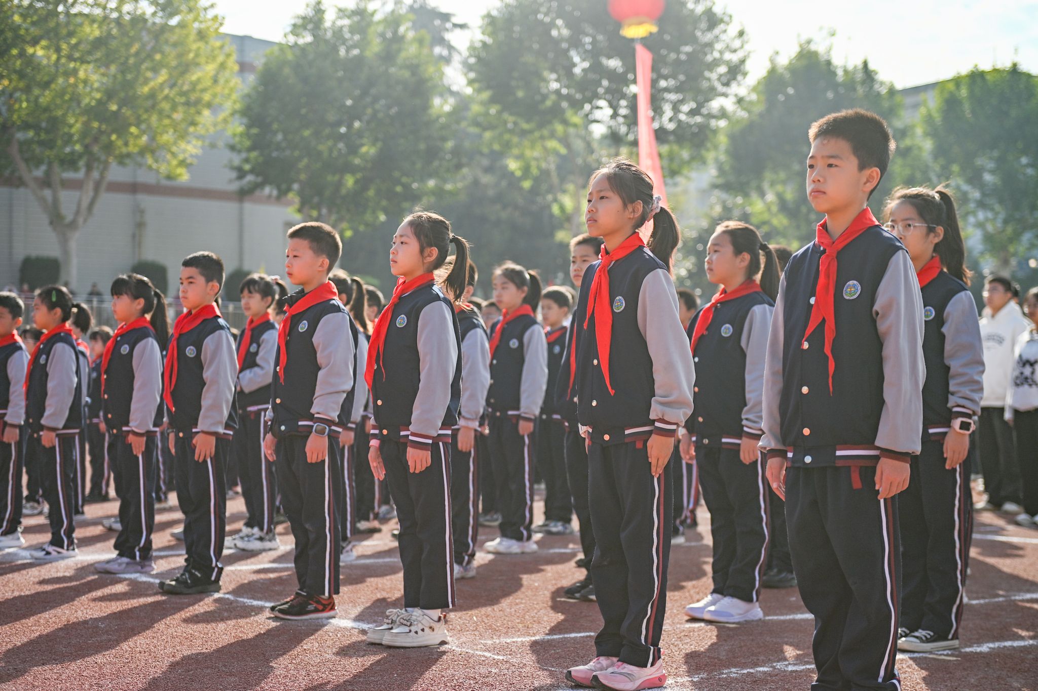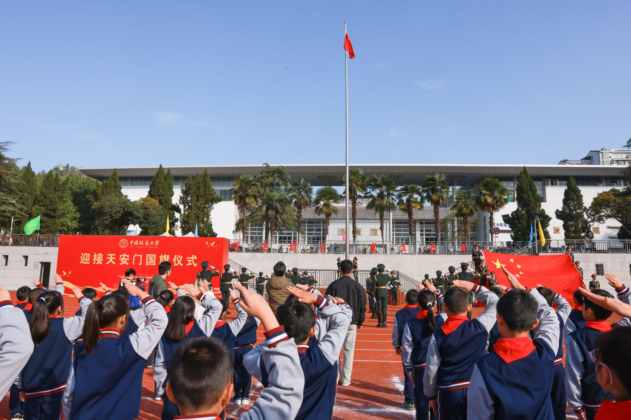 現場舉行升國旗儀式,少先隊員行隊禮,全體師生肅立并行注目禮。