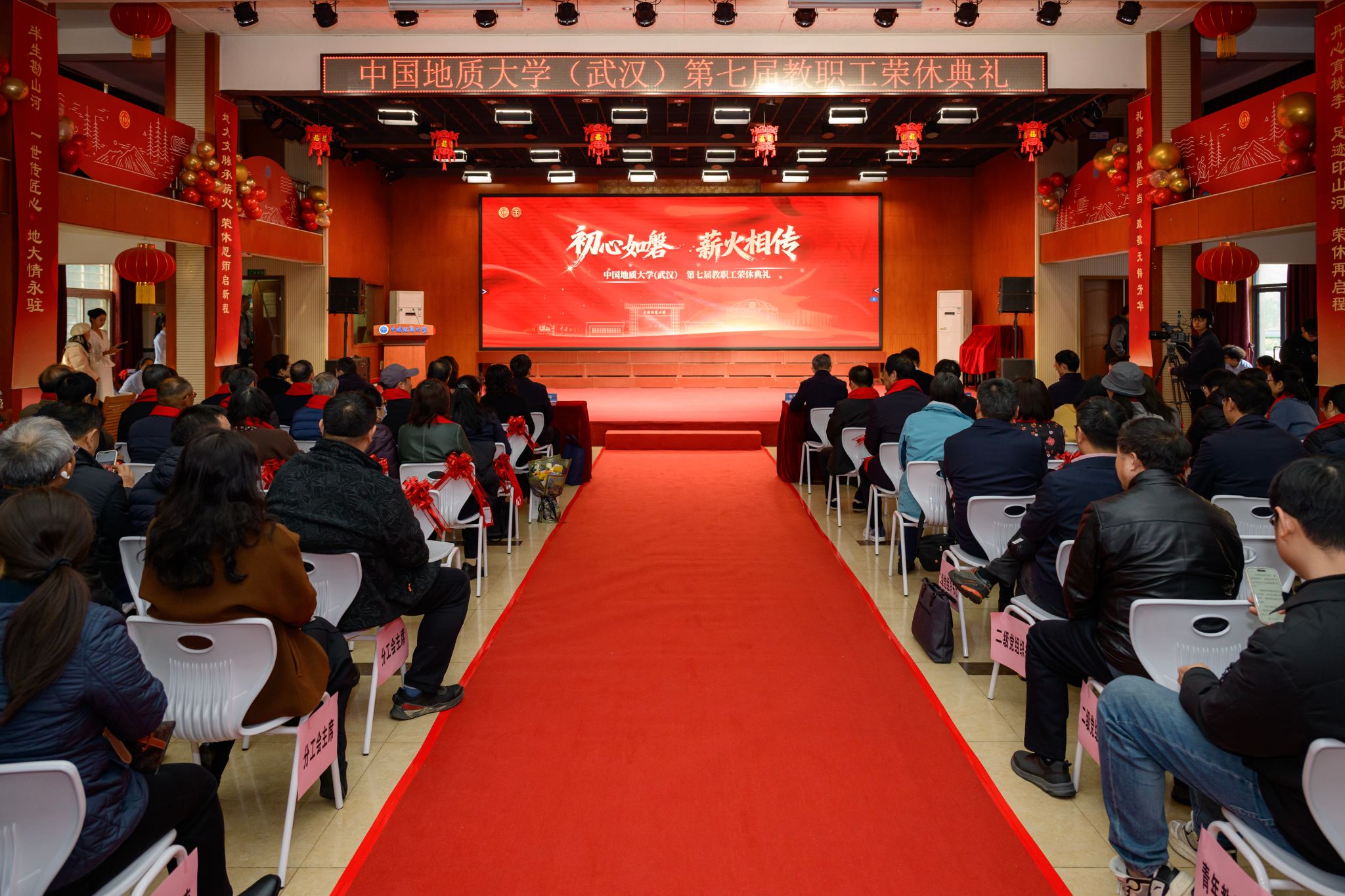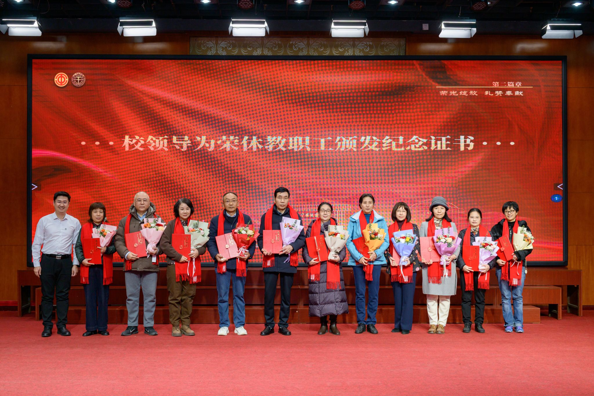 地大新聞網訊 (通訊員 張甜甜 李夢琳 攝影 程璜鑫 孫彥欽)一片冰心,春風化雨;兩鬢霜華,桃李芬芳。12月19日,我校第七屆教職工榮休典禮在南望山校區東區教工活動中心綜合廳舉行。校長李建威,校黨委副書記、工會主席王甫,副校長夏帆,榮休教師、學校相關管理與服務部門負責人、各二級黨組織書記、分工會主席,以及青年教師代表、學生代表近130人參加典禮。