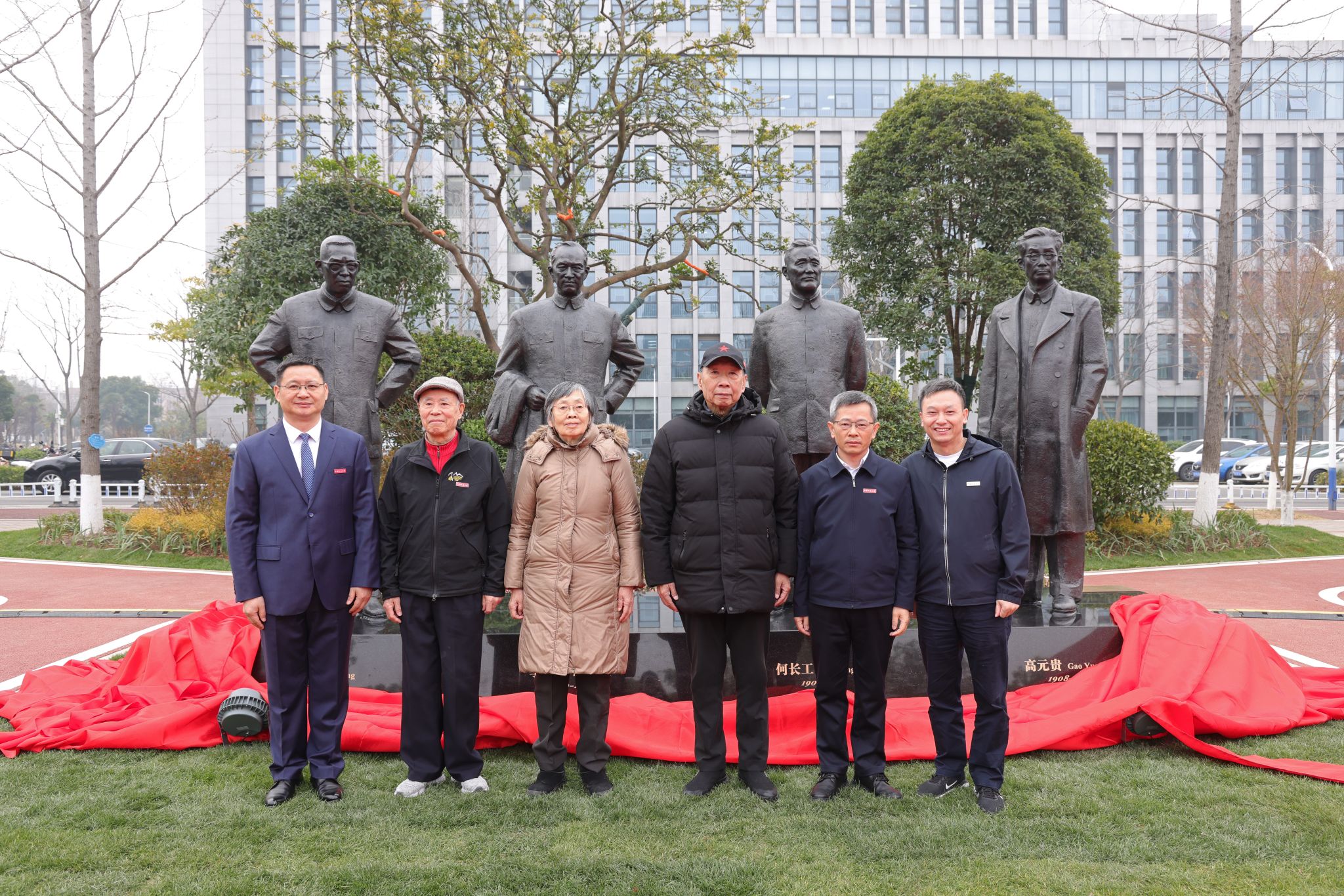元勛家屬代表何光曄、劉松柏,老校長張錦高、雕塑捐贈人肖萍、校黨委書記劉杰、校長李建威共同為《元勛》群像雕塑揭幕。