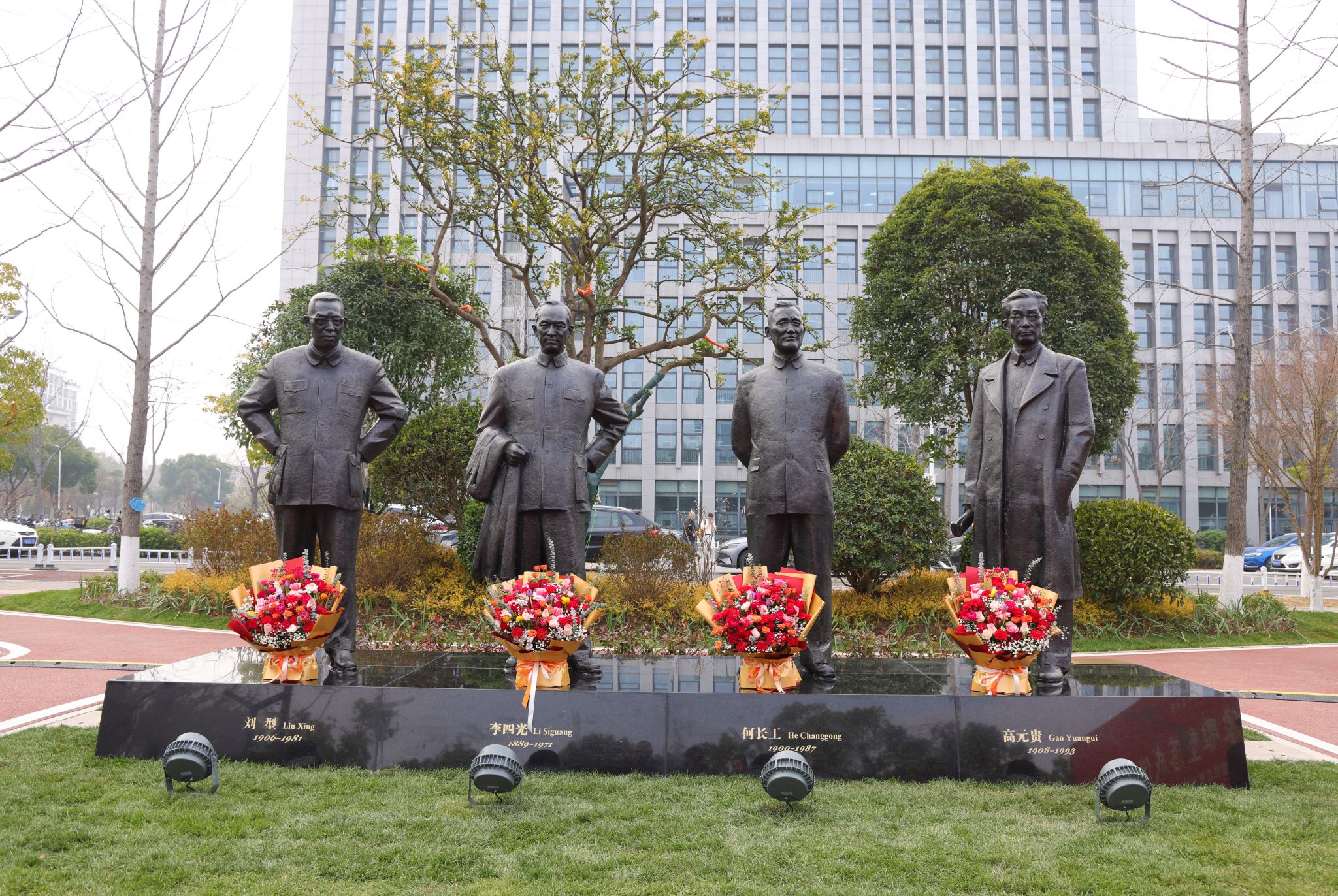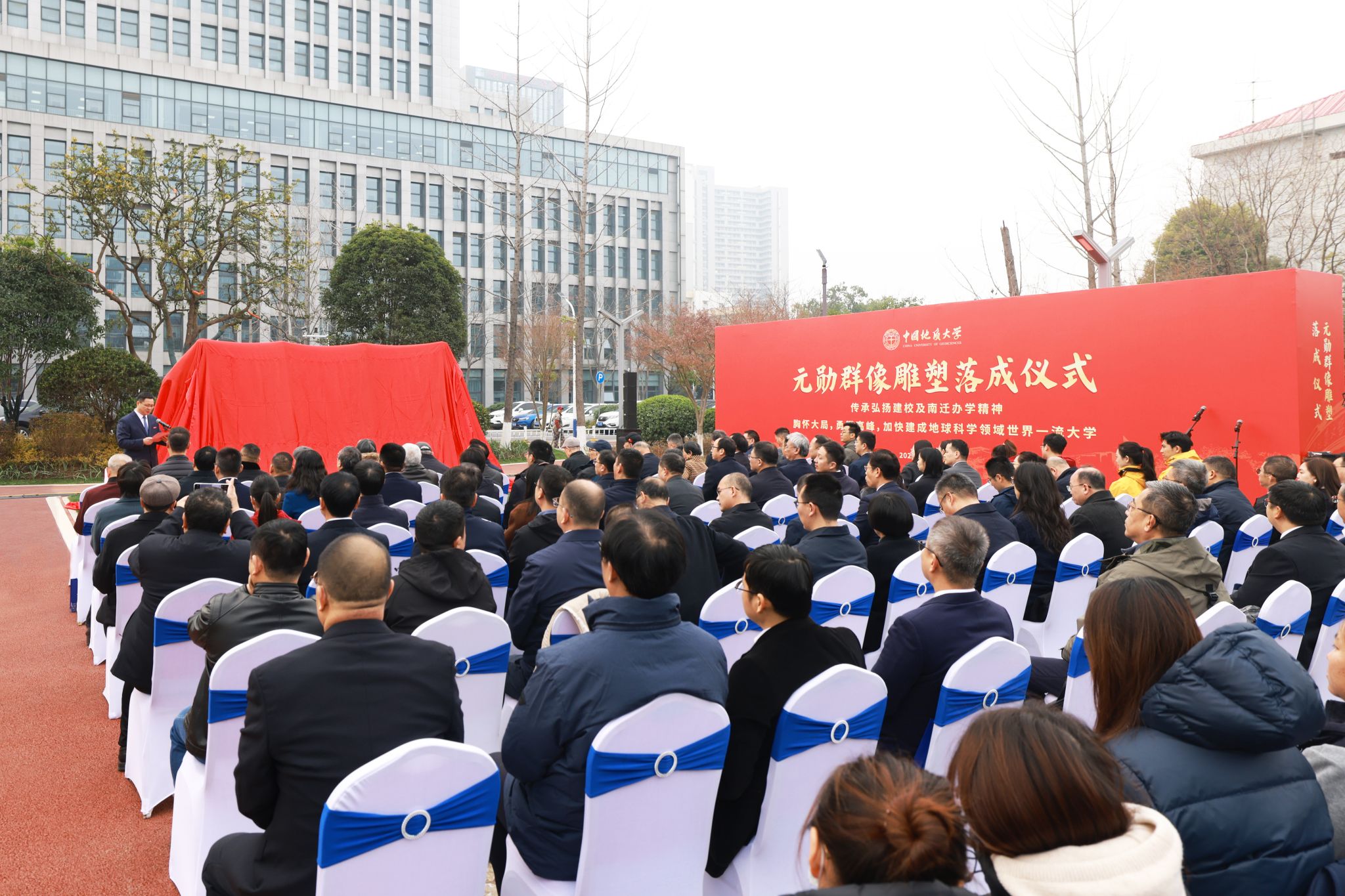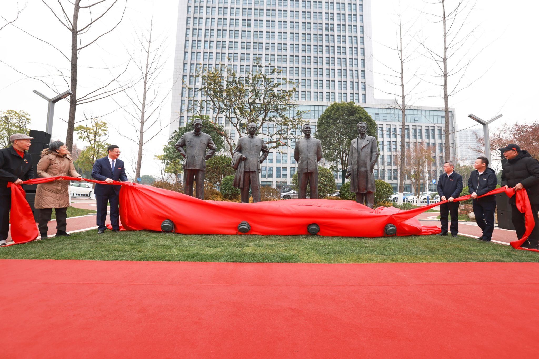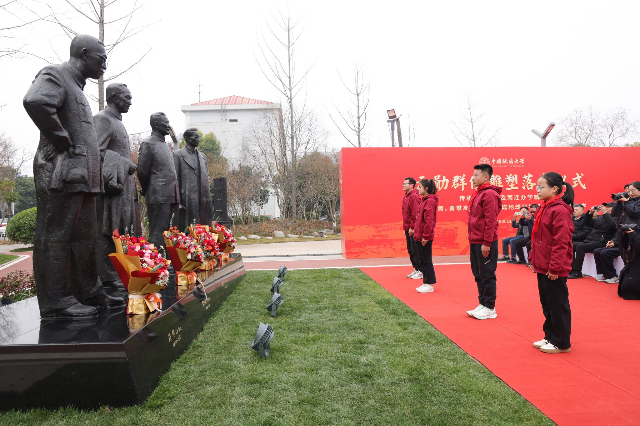 地大新聞網訊 (記者 焦思勤 孫彥欽)12月30日,我校《元勛》群像雕塑落成儀式在南望山校區舉行。何長工同志之子、江西省中國工農紅軍研究會常務副會長何光曄,劉型同志之女劉松柏、女婿梁漢平,江西省中國工農紅軍研究會副秘書長唐金福、辦公室副主任陳炳中,雕塑捐贈人、中國地質大學廣東校友會會長、深圳校友會會長、深圳貝仕達克技術股份有限公司董事長肖萍,雕塑創作者萬升義,全體在校校領導,老領導、老同志代表、中層干部、校友代表及師生代表參加儀式,共同見證這一莊嚴時刻。
