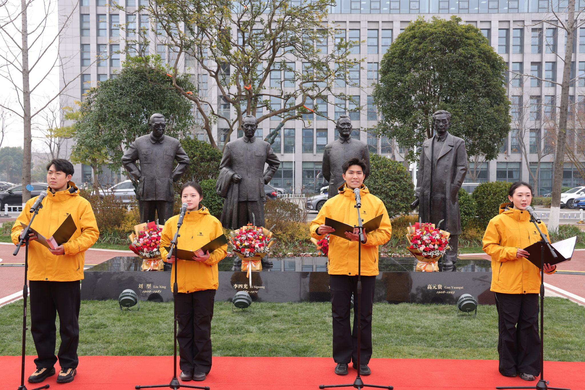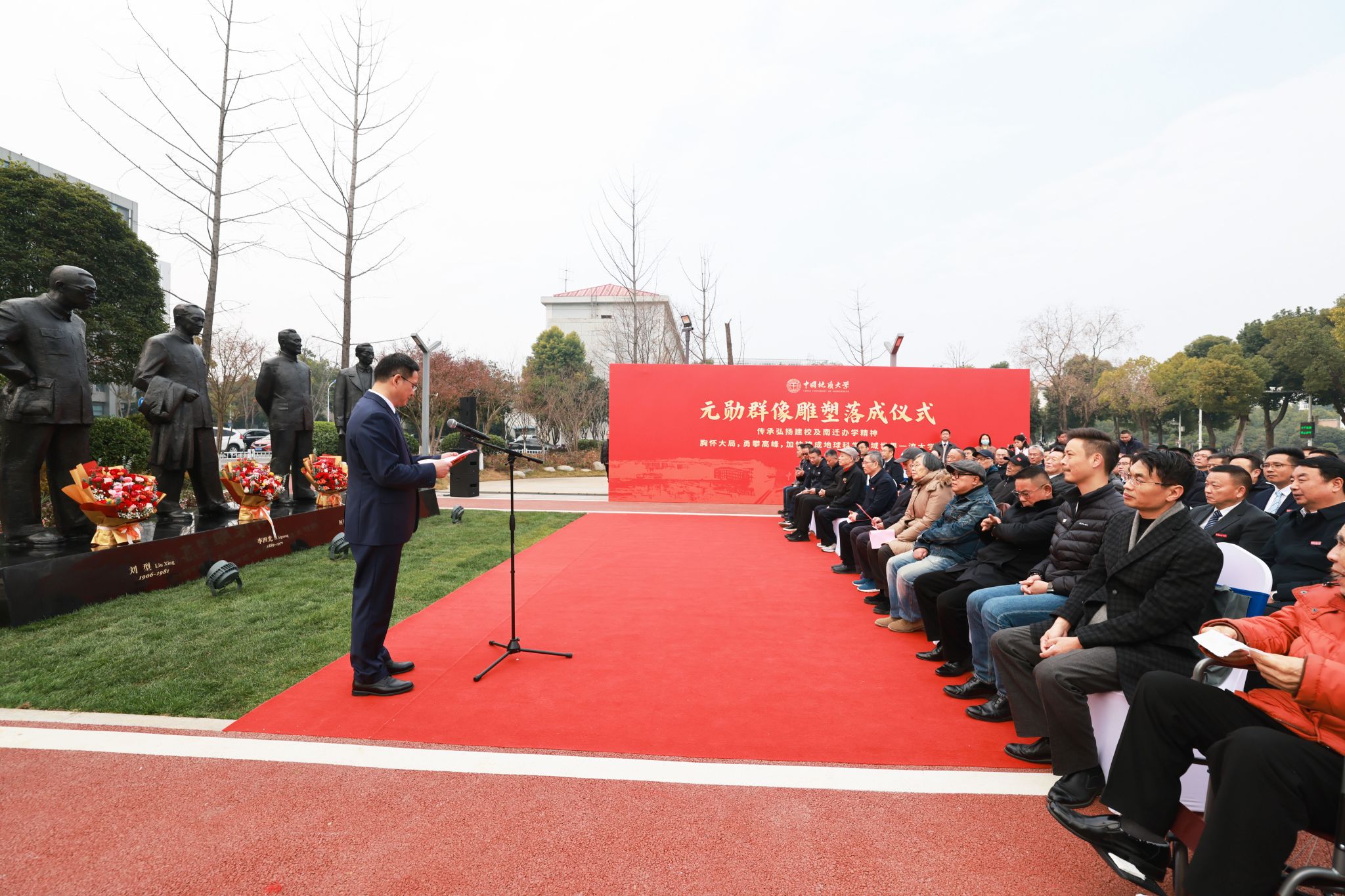 校黨委副書記王林清介紹了《元勛》群像雕塑建設有關情況。雕塑以李四光、何長工、劉型、高元貴四位建校與南遷辦學元勛為原型,以青銅鑄就,總高(含基座)達2.75米,其中人物高度2.3米,屹立于校園核心區域。他表示,學校黨委高度重視此項工作,歷經多方論證與創作最終得以呈現。《元勛》群像雕塑是銘記歷史、傳承精神的莊嚴載體,代表著全體地大人對四位元勛的深切緬懷與崇高致敬,將成為地大文化育人的新陣地。