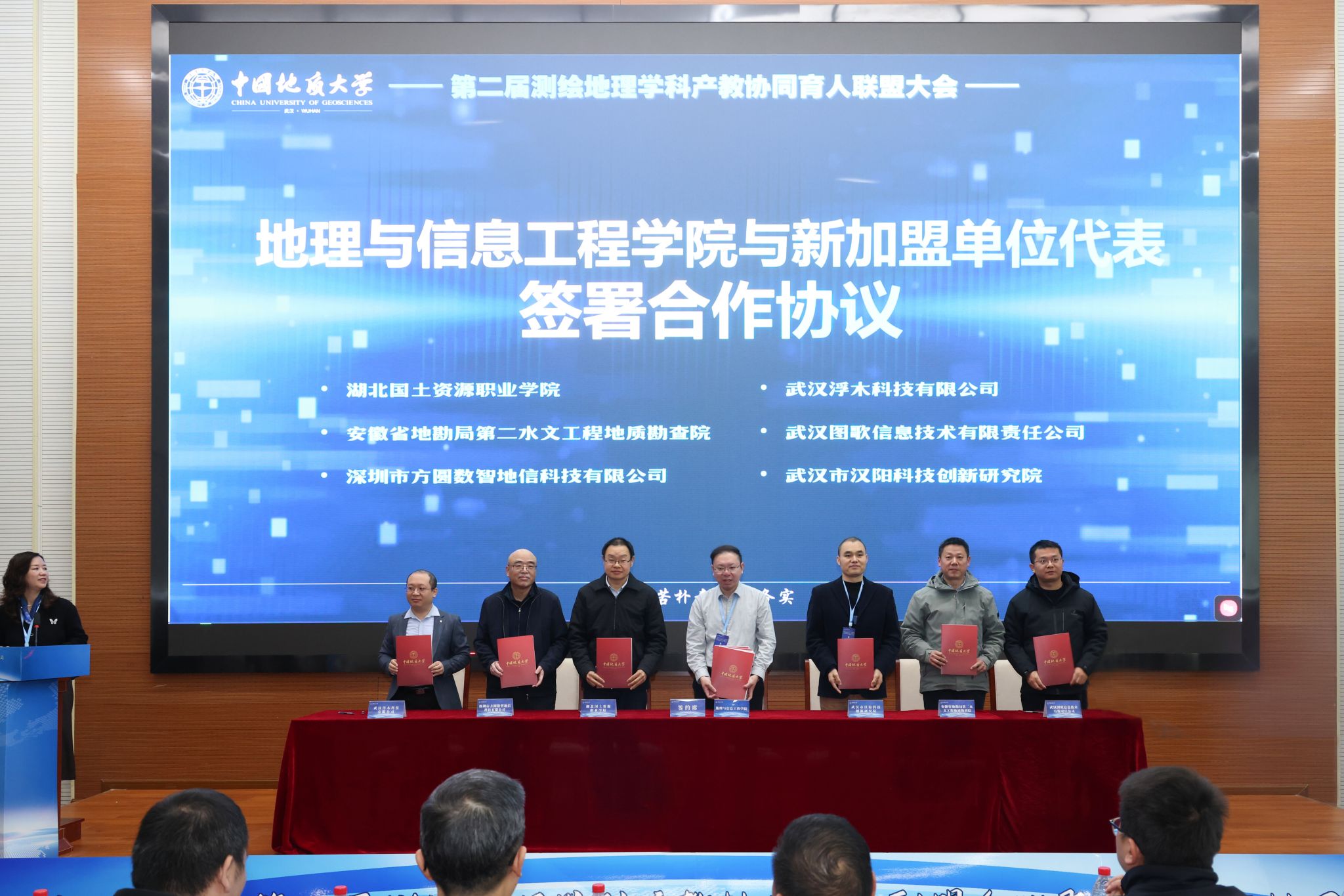 會上,為新加盟中國地質大學“地質e站”的六家單位揭牌。地理與信息工程學院與新加盟聯盟單位代表現場簽署合作協議,為新成員單位授牌,并為新聘校外企業導師代表頒發聘書。