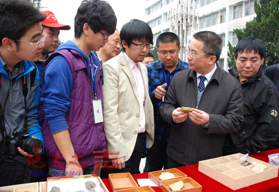 4月1日,中國地質大學(武漢)地球科學學院“地學文化節之大型化石展”活動在武漢成功舉行?;顒蝇F場展出了從寒武紀至新生代不同時代的化石600余塊,涵蓋了常規教學中的大部分種屬?;膩碓礊榈厍蚩茖W學院研究生、本科生野外采集以及化石愛好者收藏所得。圖為校長王焰新(右二)參觀化石展。屠傲凌攝
