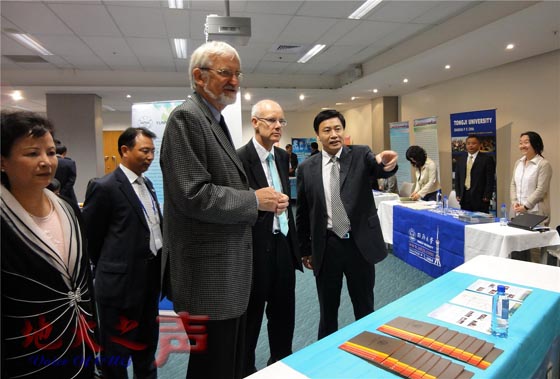 二、中國駐新西蘭徐建國大使、駐奧克蘭廖菊華總領事、駐悉尼總領事館白剛教育參贊分別出席了教育展并參觀我校展臺,以及向參展外賓介紹我校。圖為中國駐新西蘭徐建國大使向外賓介紹我校。