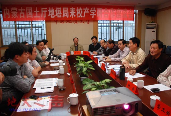 9月26日,內蒙古自治區國土資源廳副巡視員高華、內蒙古自治區地勘局副局長呂福生一行來校,就與我校展開產學研合作交流問題進行座談,校黨委書記郝翔,副校長邢相勤、唐輝明參加座談會。(屠傲凌攝)