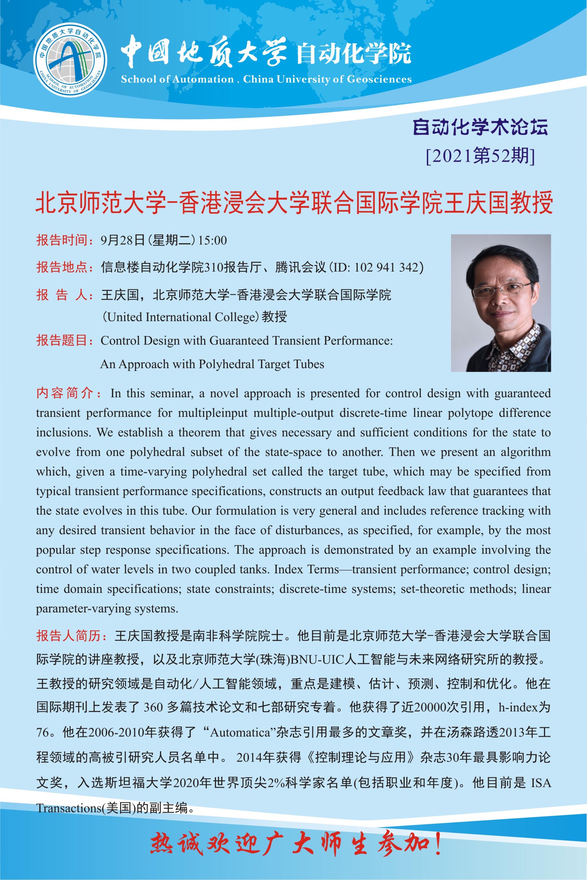 【9月28日】自動化學術論壇:北京師范大學-香港浸會大學聯合國際學院王慶國教授學術報告