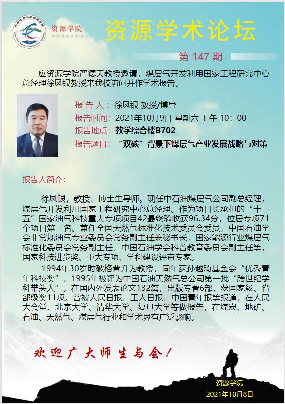 【10月9日】資源學術論壇:煤層氣開發利用國家工程研究中心總經理徐鳳銀教授學術報告
