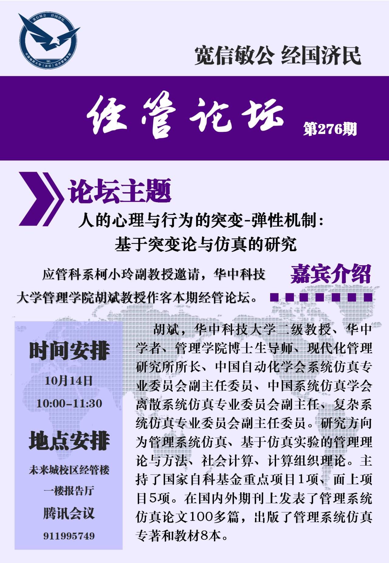 【10月14日】經管論壇:人的心理與行為的突變—彈性機制:基于突變論與仿真的研究