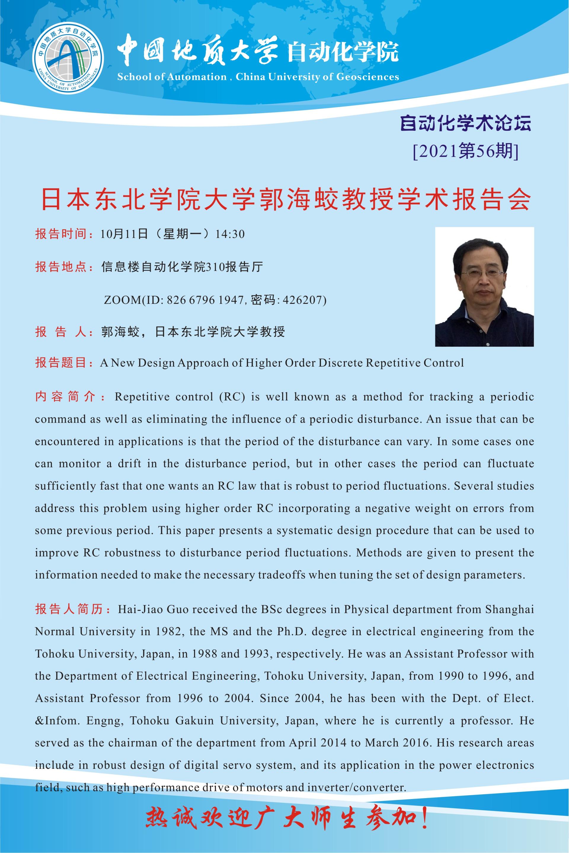 【10月11日】自動化學術論壇:日本東北學院大學郭海蛟教授學術報告