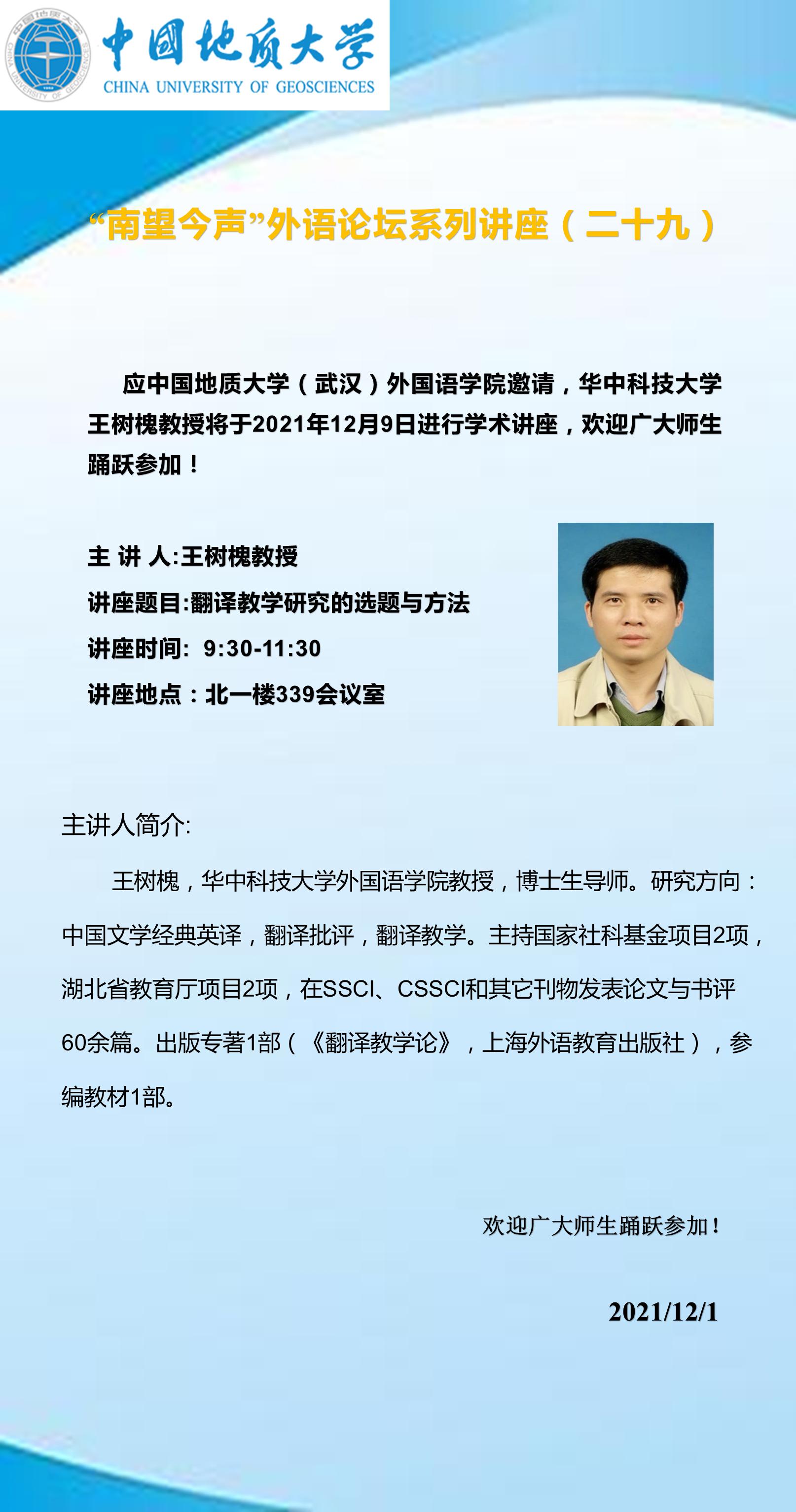 【12月9日】“南望今聲”外語系列講座:華中科技大學王樹槐教授學術報告