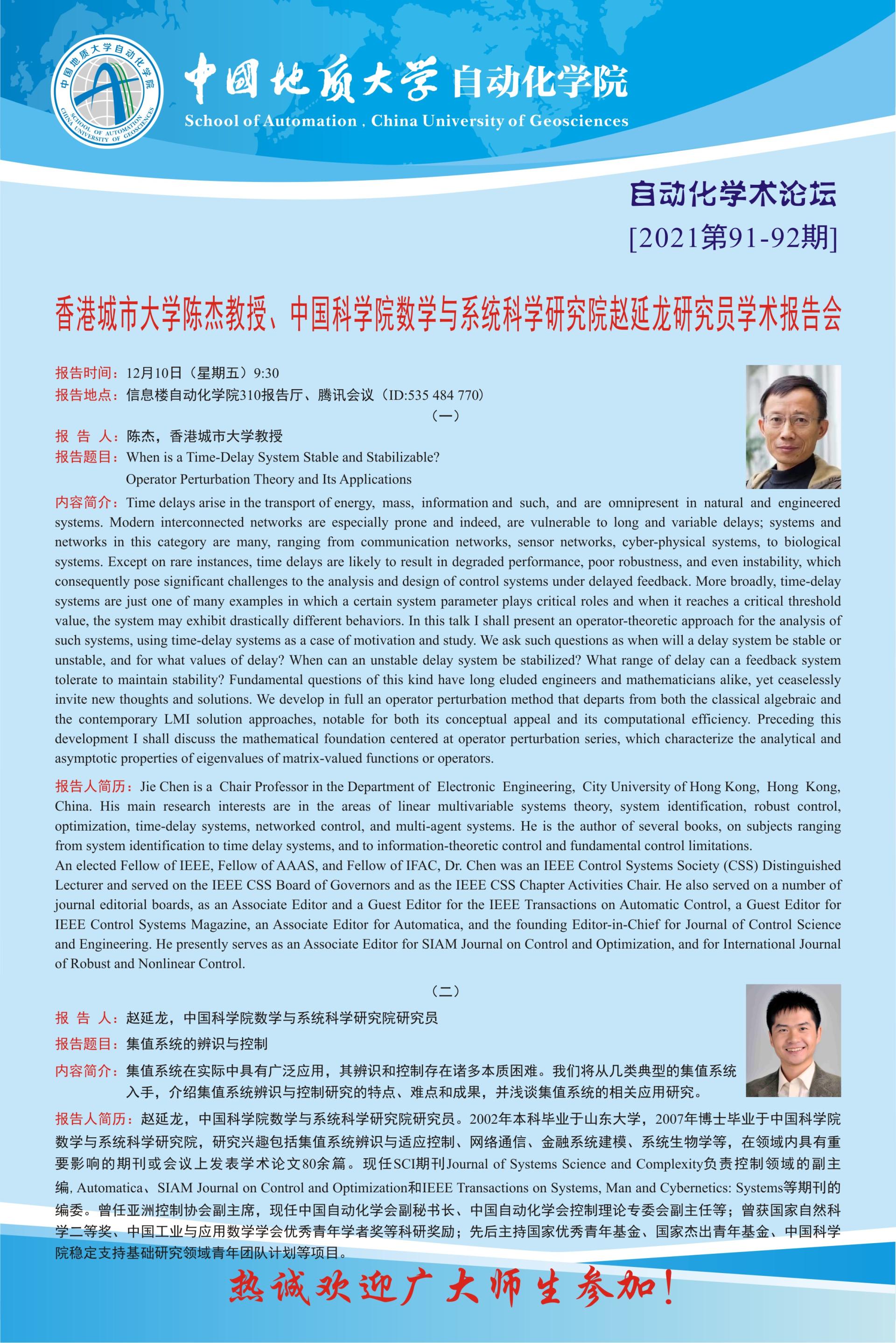 【12月10日】自動化學術論壇:香港城市大學陳杰教授、中國科學院數學與系統科學研究院趙延龍研究員學術報告