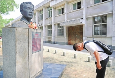 9月2日上午,張?jiān)骑w到未來城校區(qū)報(bào)到,中午匆匆吃了幾口盒飯,12時(shí)30分坐上到南望山校區(qū)的校車。下午1時(shí)30分,他手捧花束,來到父親的雕像前,深深地鞠躬。