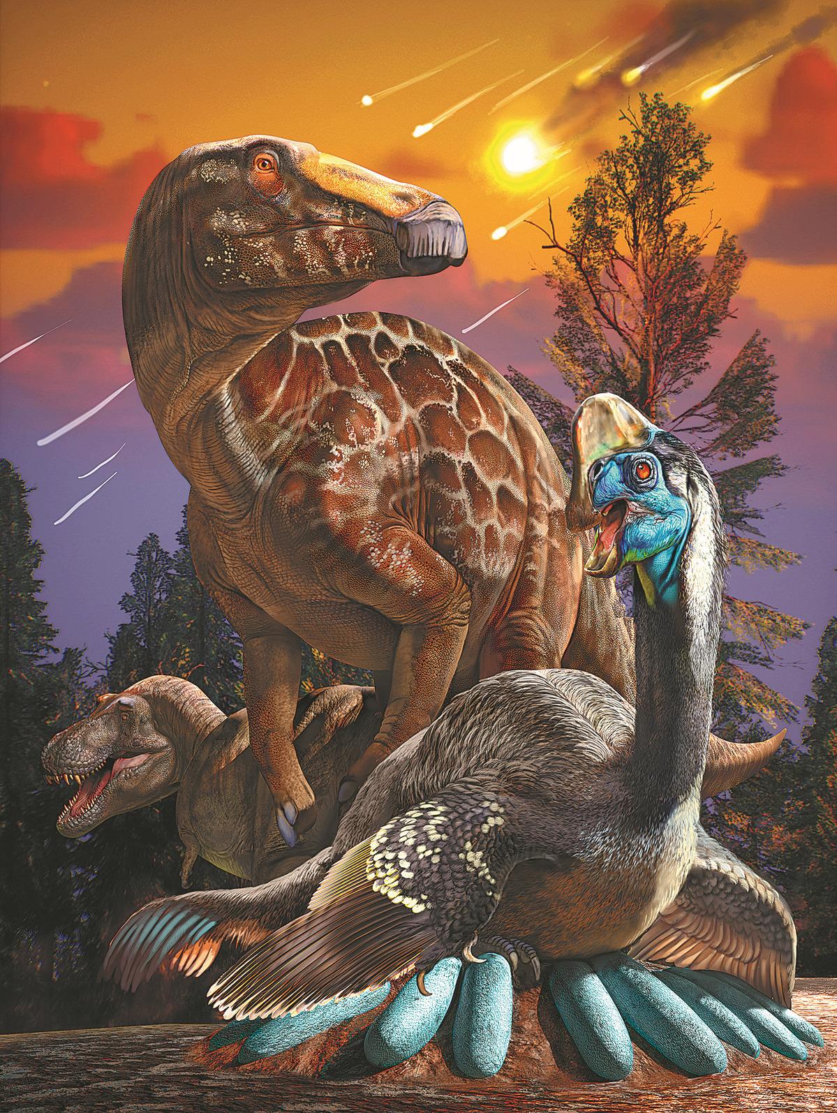 An artist's impression of three major dinosaurs living in Shanyang Basin of today's Shaanxi province during the late Cretaceous Period before their extinction. [Photo by ZHAO CHUANG/FOR CHINA DAILY]