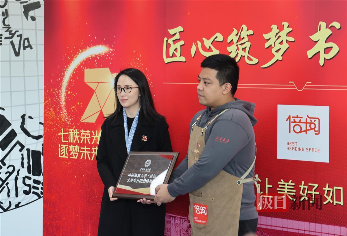 活動現場,中國地質大學(武漢)本科生院副院長孟霞向倍閱·未來城書店授“中國地質大學(武漢)創新創業教育實踐基地”牌匾;中國地質大學(武漢)團委書記朱荊薩向倍閱·未來城書店授“中國地質大學(武漢)大學生社團活動基地”牌匾。