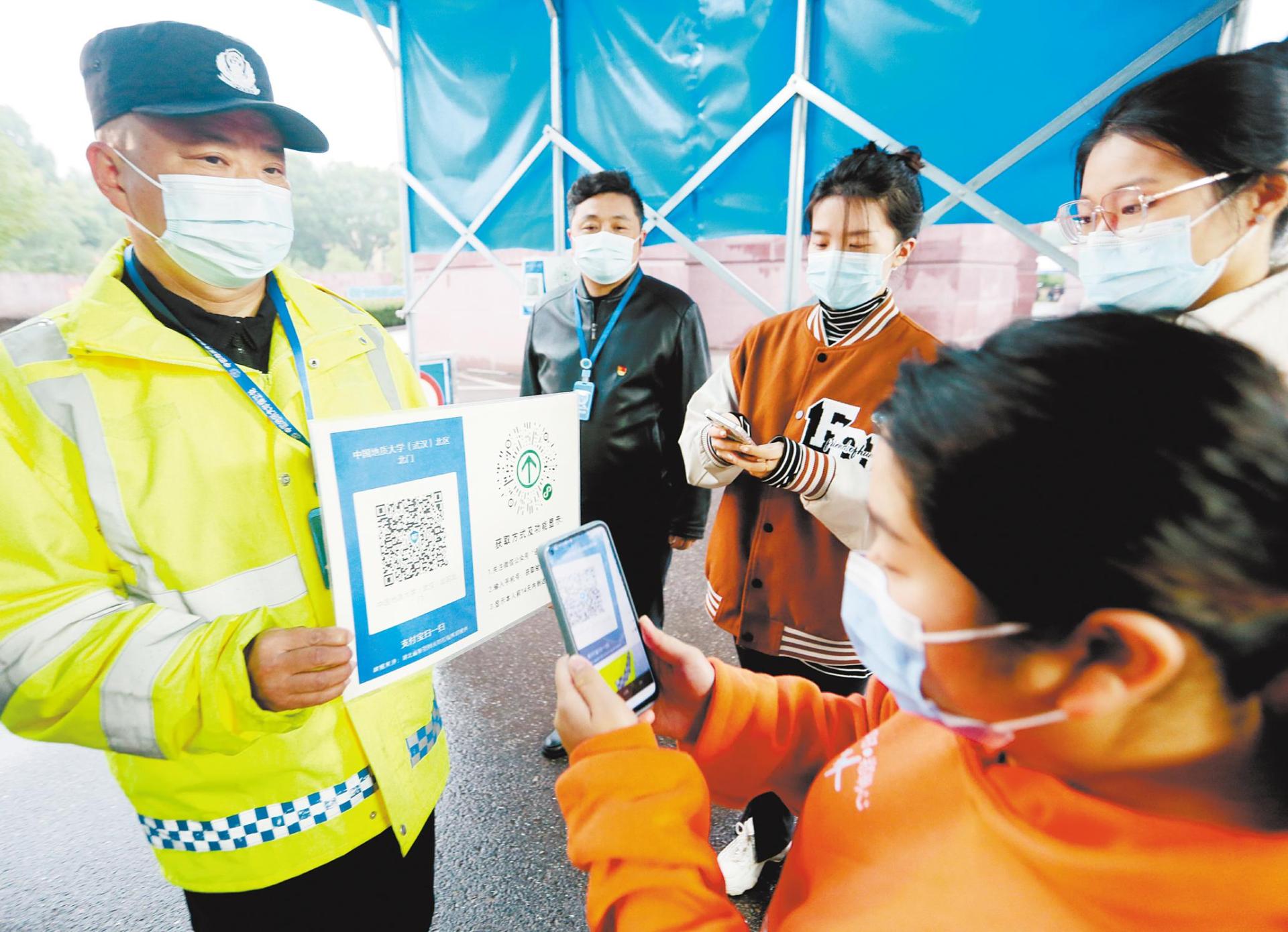 11月21日,中國地質(zhì)大學(武漢)安全保衛(wèi)人員嚴格查詢進出校園北區(qū)師生的健康綠碼和通信大數(shù)據(jù)行程。
