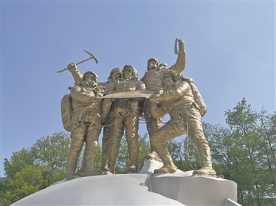 從遠處看,這尊名為《攀登》的雕塑高大雄偉,上半部分的攀登者雕像,由五名登山科考隊員組成,雕像中,有的高舉冰鎬,有的手持“登山隊”的隊旗。每個雕像看上去神采奕奕,他們注目遠方,眼神里充滿自信。而雕塑的下半部分,是一個具有現代風格的不銹鋼地球穹頂造型。穹頂的內部,則是聲光電的裝置,若是晚上來參觀,整個雕塑顯得“光彩照人”。