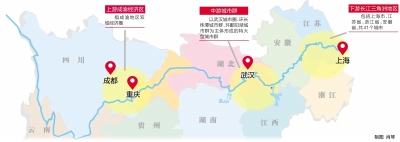長江經濟帶,以長江黃金水道為依托,發揮上海、武漢、重慶的核心作用。長江經濟帶宛如一條巨龍,下游的上海是“龍頭”,中游的武漢是“龍腰”,上游的重慶是“龍尾”。這三座城市背后分別對應長三角城市群、長江中游城市群和成渝城市群。