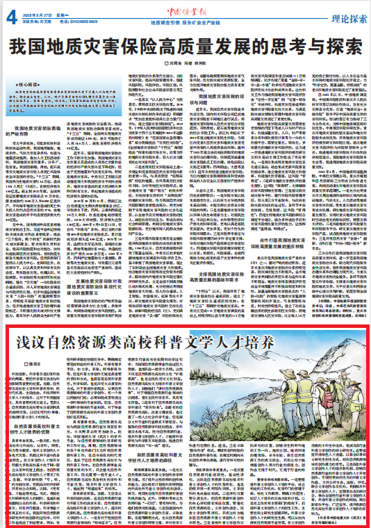 具有資源優勢。自然資源類高校與我國自然資源行業發展緊密相關,未來兩者必將更加融合。比如,中國地質大學(武漢)的學科專業,與自然資源領域的諸多研究和工作對應。再則,自然資源領域的各個單位和部門大力開展自然資源科普工作,是自身肩負的時代責任,也樂于讓自然資源類高校參與到科普工作中。在自然資源事業高質量發展的今天,只會強化自然科普工作,因此需要一批專業人才。自然資源類高校具備相關的學科和專業優勢,培養科普文學創作人才,能起到“彎道超車”的效果。