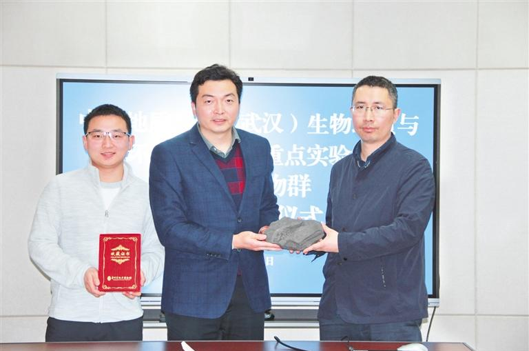 宋海軍(中)、代旭(左一)今年3月代表中國地質大學(武漢)研究團隊向省地質博物館捐贈化石標本。 貴州日報天眼新聞記者 金秋時 攝
