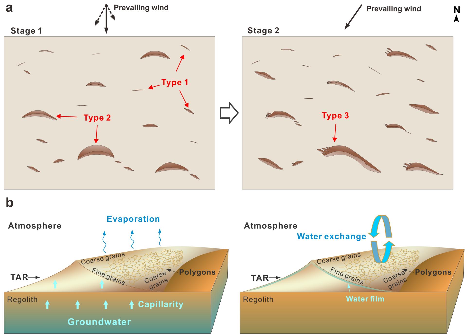 “祝融號”著陸區橫向風成脊的演化模式及表面多邊形裂隙可能的形成機制。課題組供圖