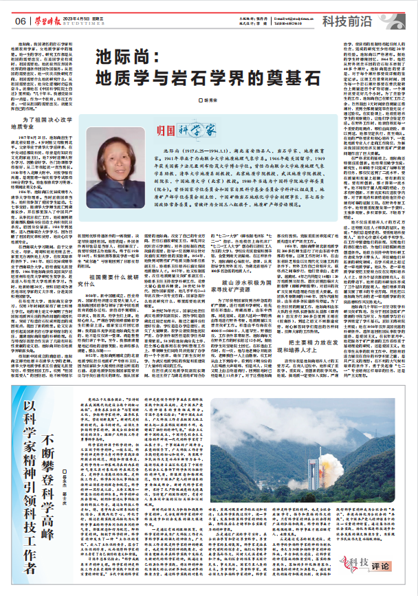 池際尚,我國著名的巖石學家和地質教育學家,女地質學家中的翹楚。她一生的學習、研究工作都是從祖國的需要出發,在美國學業有成時,祖國需要她,她就毅然放棄國外優厚的待遇條件回國為國服務;從祖國的需要出發,她一次次改換研究方向,祖國需要什么她就研究什么;從祖國需要出發,她身處逆境時仍忘我奮斗。就像她在《中國科學院院士自述》里所說:“幾十年來,我感受最深的一點是,作為一個教育、科技工作者,一切從祖國的需要出發,就能發揮自己的作用。”