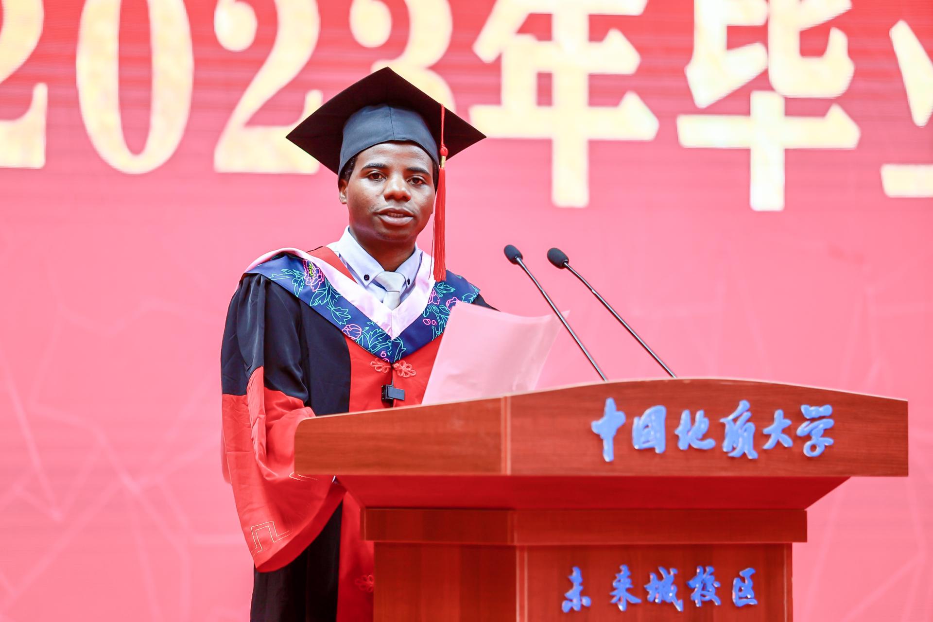長江日報大武漢客戶端6月26日訊 6月25日,在中國地質大學(武漢)舉行的2023年畢業典禮上,來自盧旺達的留學生簡安用不太流利的普通話以優秀學生代表的身份介紹自己的求學經歷:他在5年內順利完成碩士和博士的學習,靠的就是“不服周”。