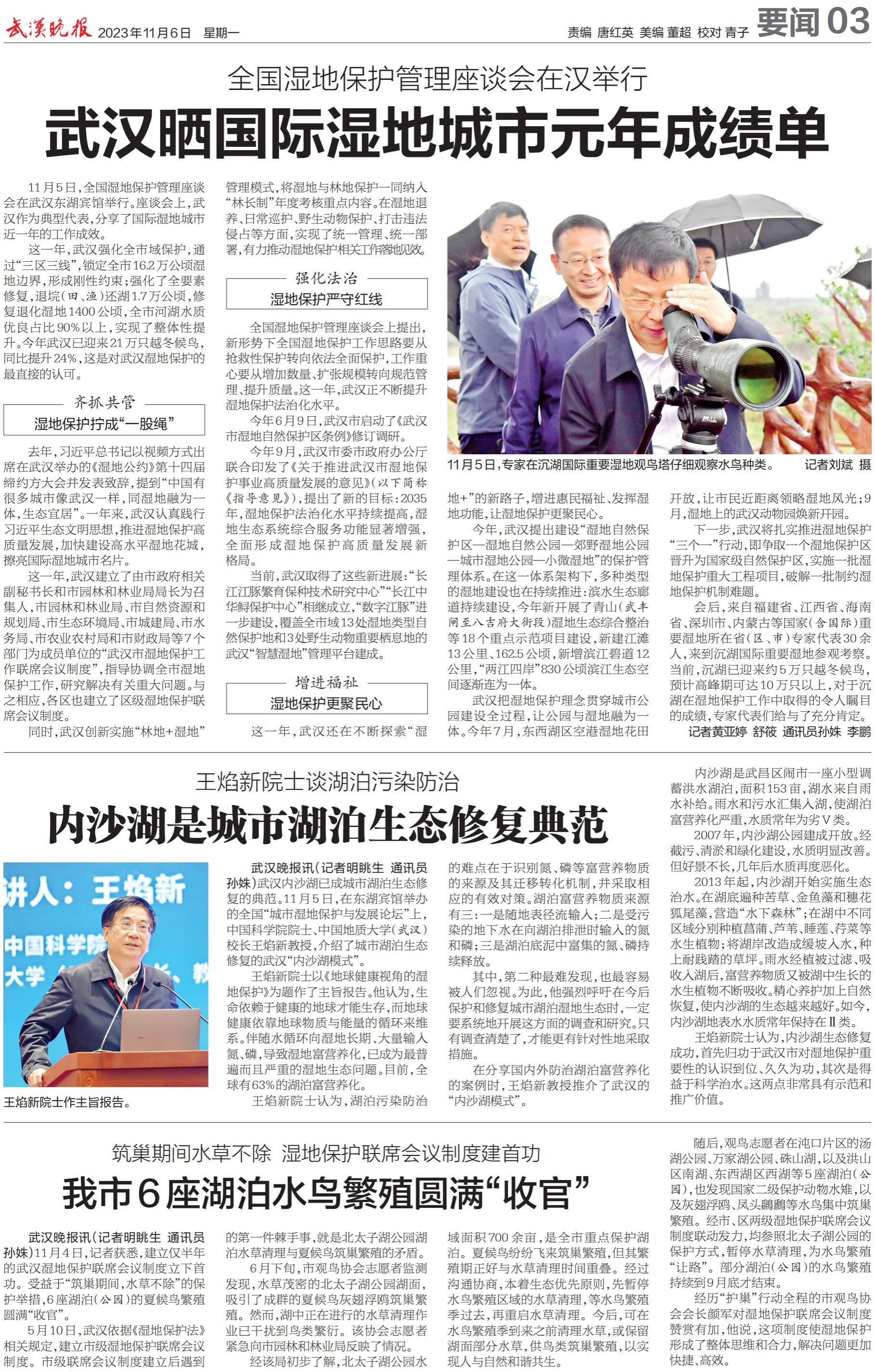 王焰新院士認(rèn)為,內(nèi)沙湖生態(tài)修復(fù)成功,首先歸功于武漢市對濕地保護(hù)重要性的認(rèn)識到位、久久為功,其次是得益于科學(xué)治水。這兩點非常具有示范和推廣價值。