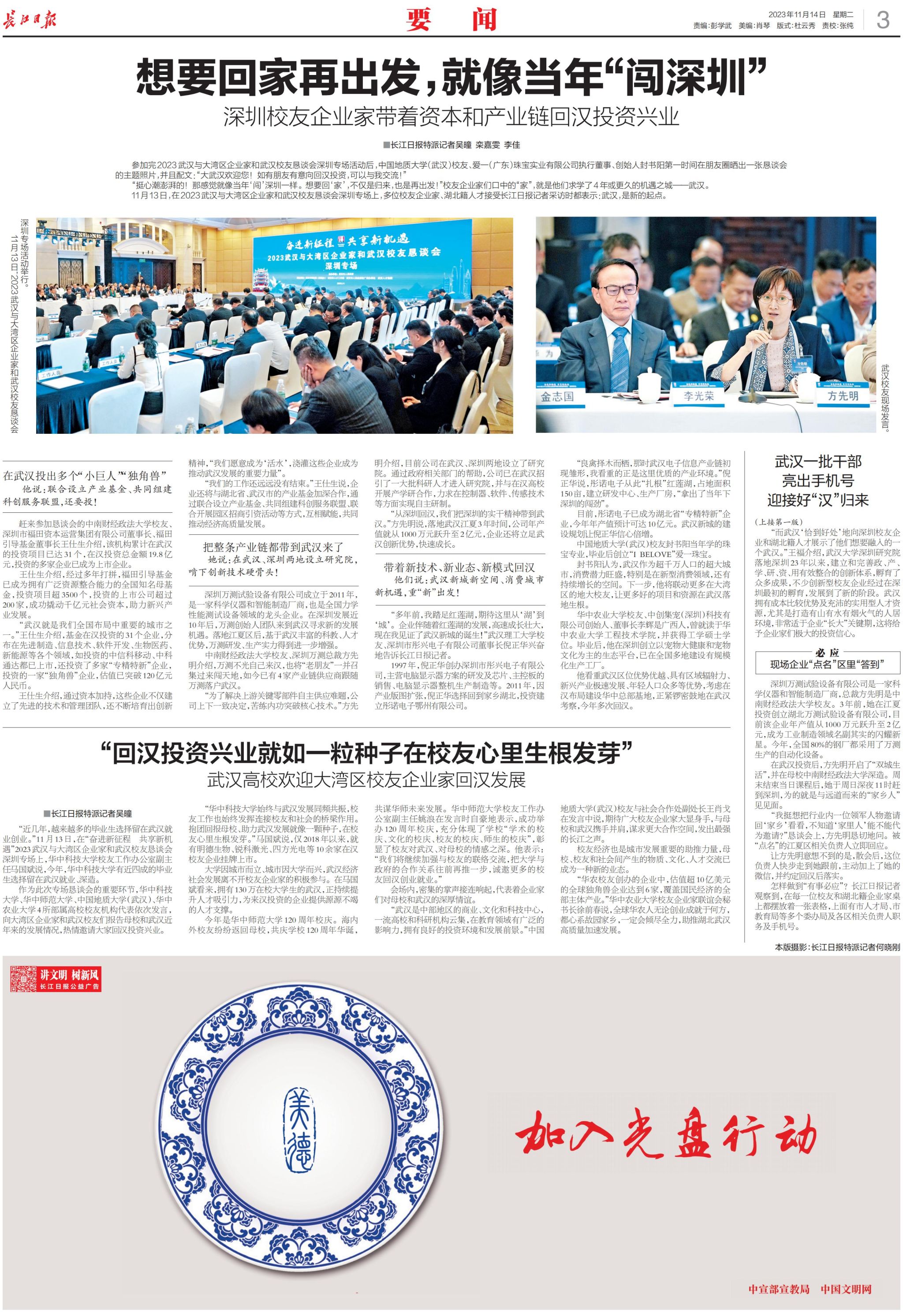 11月13日,在2023武漢與大灣區(qū)企業(yè)家和武漢校友懇談會(huì)深圳專(zhuān)場(chǎng)上,多位校友企業(yè)家、湖北籍人才接受長(zhǎng)江日?qǐng)?bào)記者采訪時(shí)都表示:武漢,是新的起點(diǎn)。