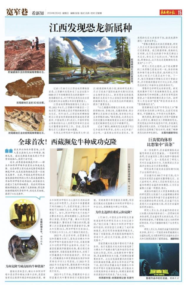 記者1月30日從江西省地質博物館獲悉,江西贛州發現命名了生活在距今9000多萬年的蜥腳類恐龍的新屬種——腔尾贛地巨龍,對于研究這類恐龍在白堊紀的演化和古地理分布具有重要意義。