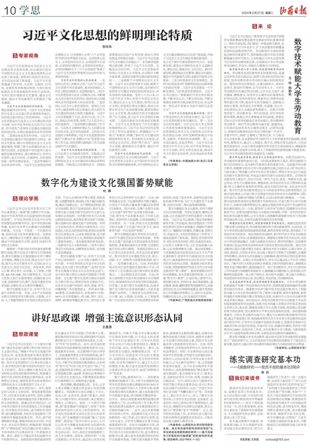 習近平文化思想的發展性特質。堅守開放包容的人類文明進步理念,是習近平文化思想的根本和靈魂所在。第一,文化交往的發展性。文化交往是人類文明得以傳承和發展的重要途徑。習近平文化思想展現出具有文化主體性和文化傳承性的理論品格,同時也鮮明體現出開拓性、創新性、開放性的全球視野。第二,文化是民族的,也是世界的。習近平文化思想堅守中華文化立場,對中華優秀傳統文化守正創新,深化文明交流互鑒,推動中華文化更好走向世界,具有深遠的世界影響。(作者:中國地質大學(武漢)馬克思主義學院 張珍珍)