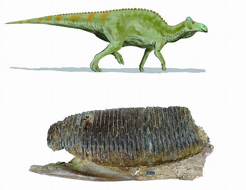 鴨嘴龍類恐龍復原圖(上圖)及下頜齒照片(下圖)。受訪者供圖