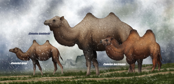 諾氏駝復原圖(中)與現生種野雙峰駝(左)和家雙峰駝(右)。陳瑜繪