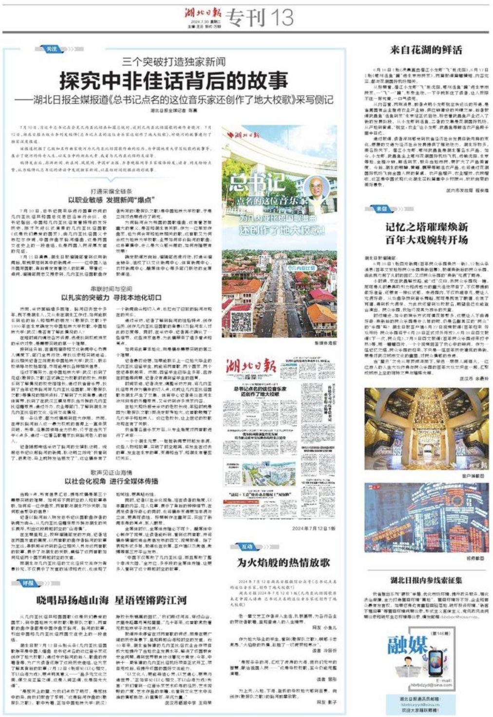 湖北日報7月12日頭版頭條《幾內亞比紹國歌原來是中國人譜曲 總書記點名的這位音樂家還創作了地大校歌》,通過專訪曉河的后人、歌曲的傳唱者等,為廣大讀者還原了這段歷史佳話,讓大家了解其背后的故事;7月12日4版評論《以心相交,不以山海為遠》,更點明其意義——“品多元文化之美,謀交流互鑒之道,這是人間正道,也是陽光大道”。