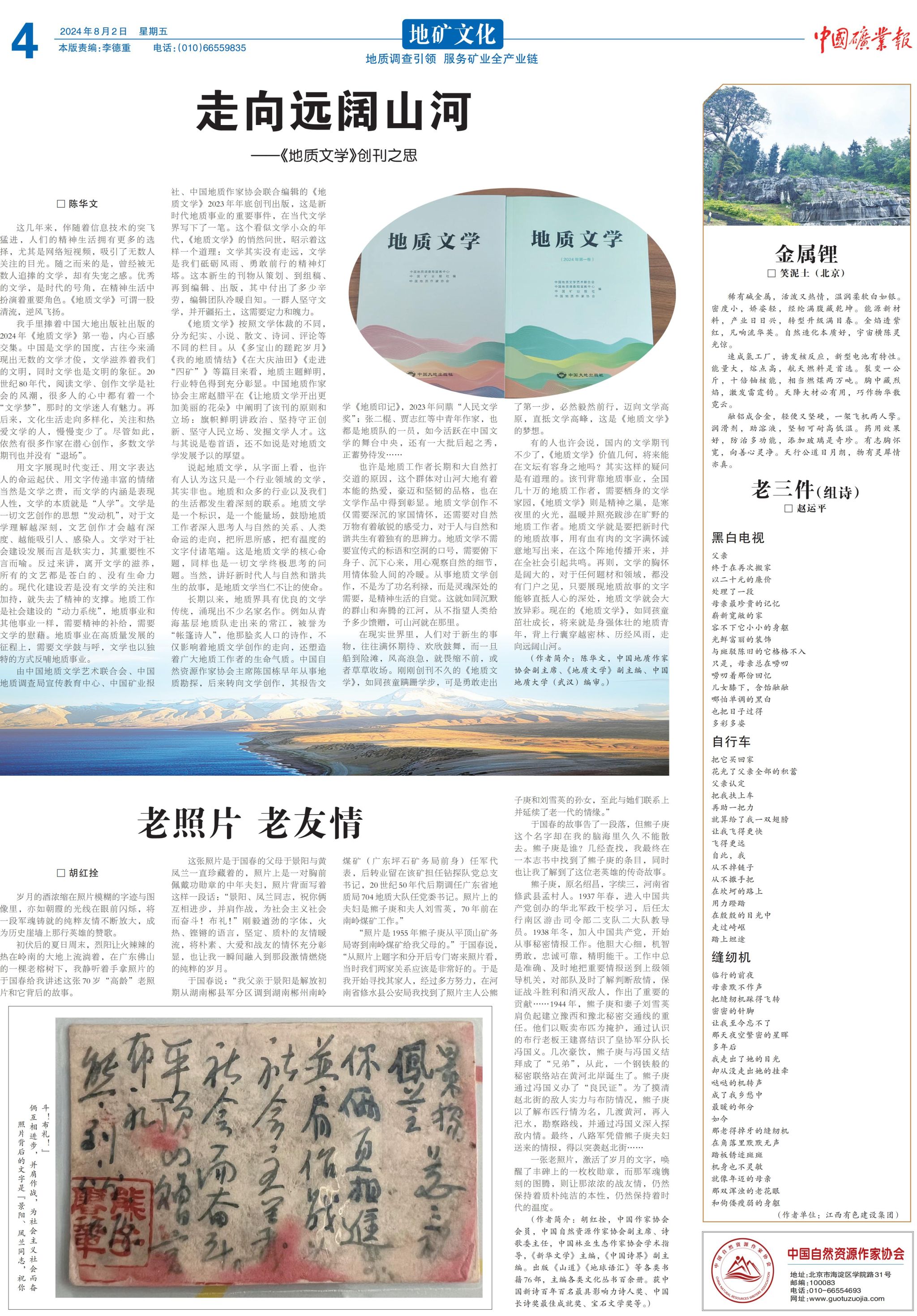 有的人也許會說,國內的文學期刊不少了,《地質文學》價值幾何,將來能在文壇有容身之地嗎?其實這樣的疑問是有道理的。該刊背靠地質事業,全國幾十萬的地質工作者,需要棲身的文學家園,《地質文學》則是精神之巢,是寒夜里的火光,溫暖并照亮跋涉在曠野的地質工作者。地質文學就是要把新時代的地質故事,用有血有肉的文字滿懷誠意地寫出來,在這個陣地傳播開來,并在全社會引起共鳴。再則,文學的胸懷是闊大的,對于任何題材和領域,都沒有門戶之見,只要展現地質故事的文字能夠直抵人心的深處,地質文學就會大放異彩。現在的《地質文學》,如同孩童茁壯成長,將來就是身強體壯的地質青年,背上行囊穿越密林、歷經風雨,走向遠闊山河。