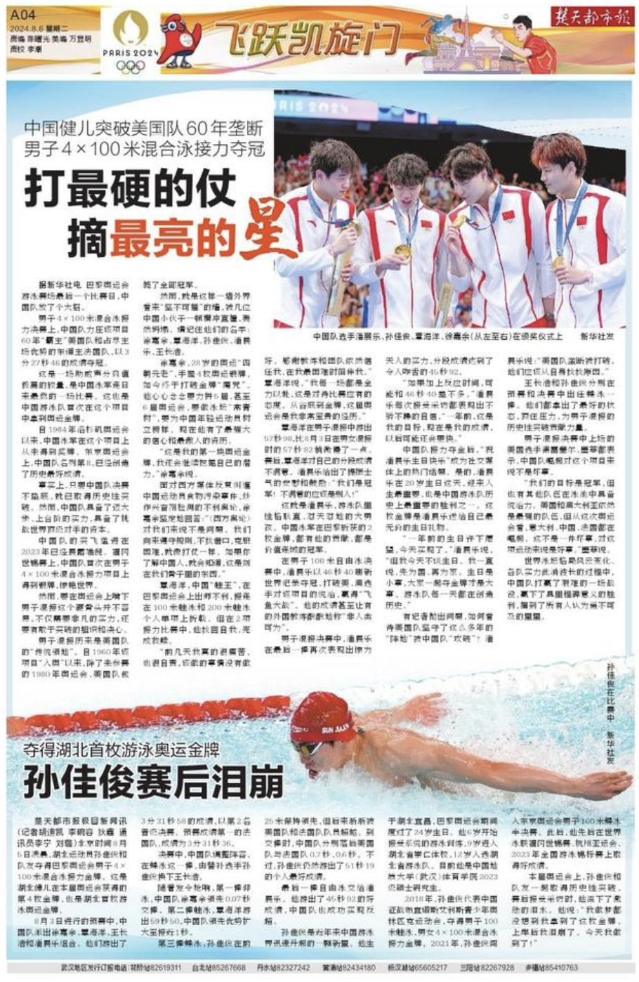 楚天都市報極目新聞訊(記者胡迪凱 李碗容 狄鑫 通訊員李寧 劉璐)北京時間8月5日凌晨,湖北運動員孫佳俊和隊友奪得巴黎奧運會男子4×100米混合泳接力金牌。這是湖北健兒在本屆奧運會獲得的第4枚金牌,也是湖北首枚游泳奧運金牌。