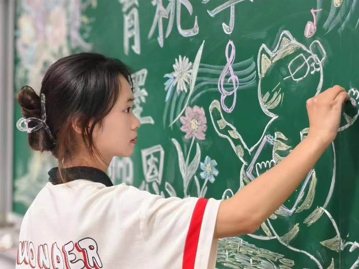 ?“在教師節這天,帶領廣大同學向老師表達敬意和感謝已經成為我們的慣例,自2021年起,從繪制板畫到隧道壁畫,再到裝飾教學樓的臺階……四年間已有上千名同學參與其中。今年除了繪制板畫,我們還專門制作了節日海報,和后勤的工作人員一起,將兩校區所有教室的多媒體設備壁紙都替換了。”學校“青馬工程”學員、學生會執行主席孫佳怡介紹道。