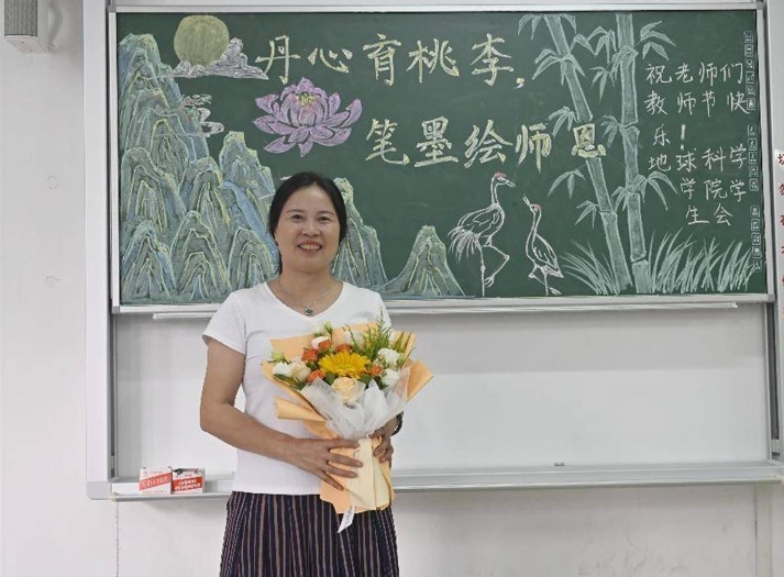 ?9月10日清晨,當中國地質大學材料與化學學院老師王群英步入教室時,一幅精美的板畫映入眼簾。“王老師,您好!祝您教師節快樂!”班上的同學獻上鮮花,并齊聲送上祝福。王老師感動得眼角濕潤,以爽朗的笑聲回應了學生們的心意。這一刻,兩校區百余間教室內,都上演著同樣溫馨的一幕。
