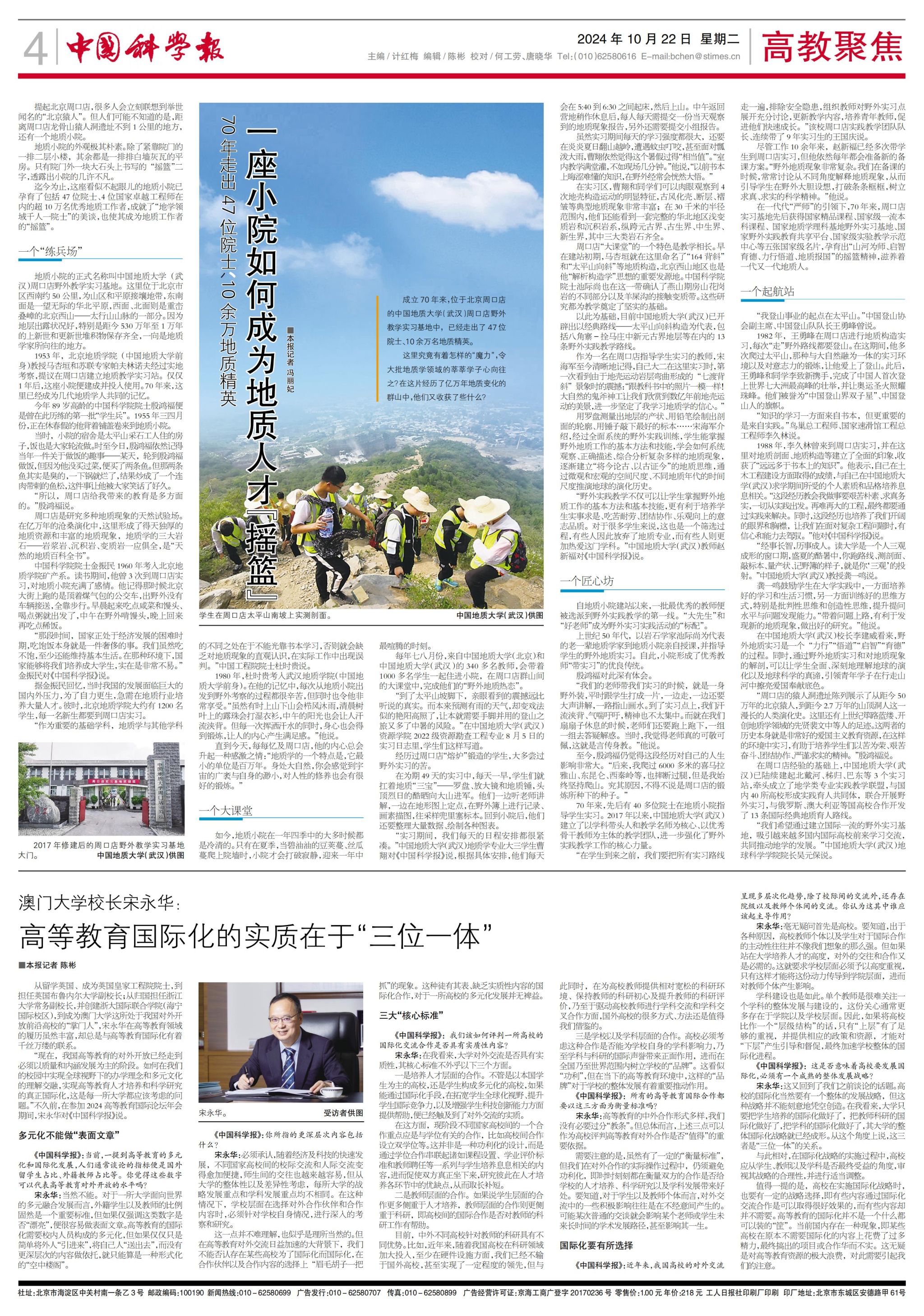 在周口店經驗的基礎上,中國地質大學(武漢)已陸續建起北戴河、秭歸、巴東等3個實習站,牽頭成立了地學類專業實踐教學聯盟,與國內40所高校形成實踐育人共同體,聯合開展野外實習,與俄羅斯、澳大利亞等國高校合作開發了13條國際經典地質育人路線。